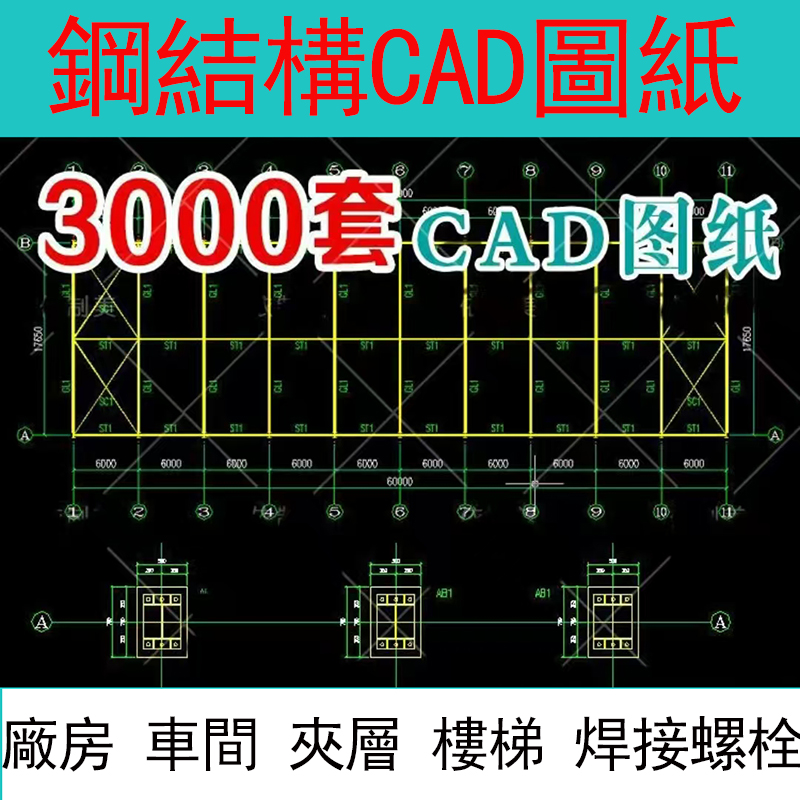 3000套鋼結構CAD圖紙 車間廠房 樓梯 夾層 鋼結構焊接 螺栓CAD圖紙(64G 隨身碟出貨 免下載 即插即用)