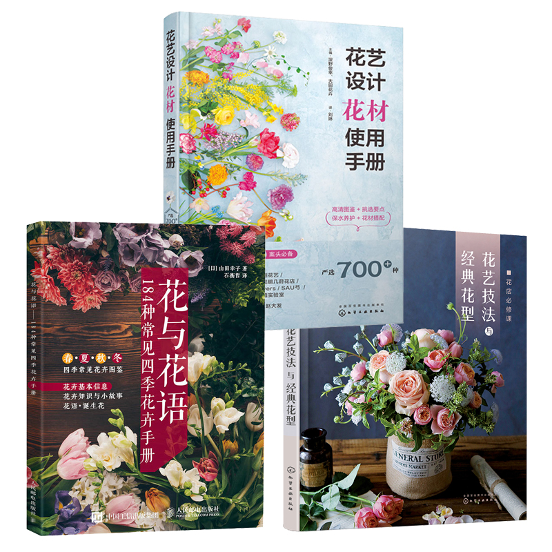 【花藝設計花材使用手冊】+【花藝技法與經典花型】+【花與花語】3冊 花藝師、花店必備,高清圖鑑+挑選方法+養護方法+搭配原則,花材問題,通通解決