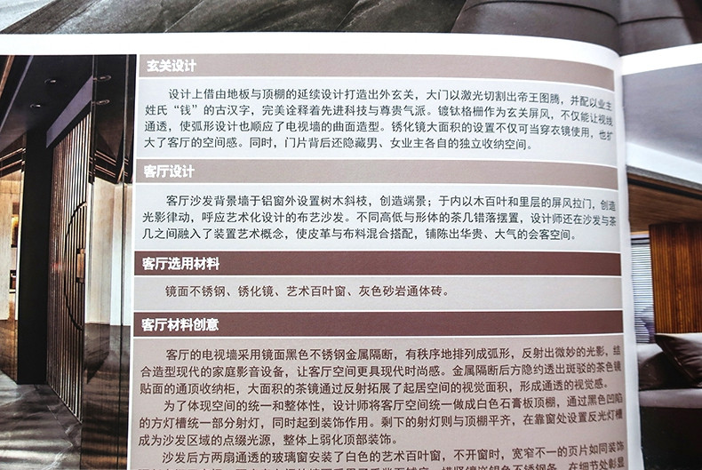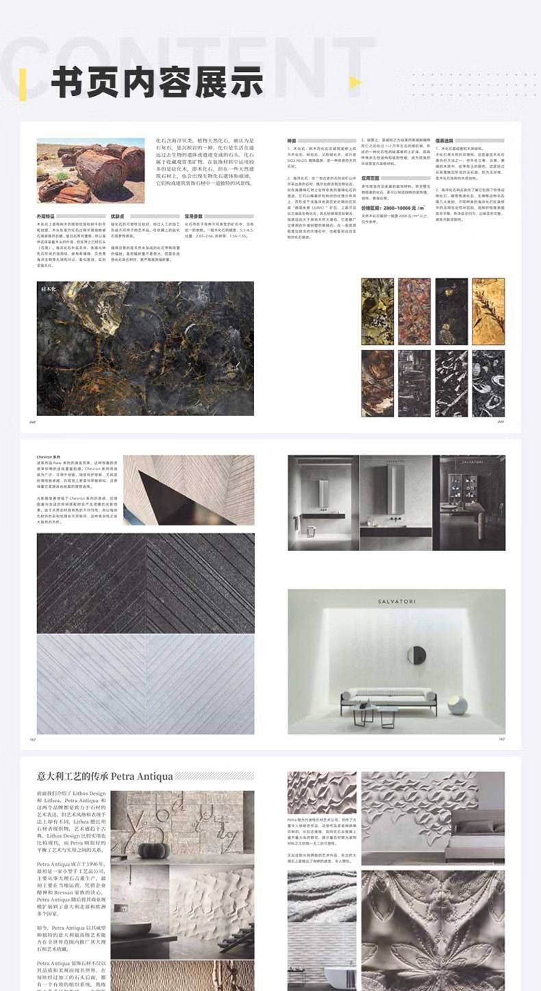 透過詳細的實景圖,《台式風格材料運用與解析(2)》從多個面向多角度剖析其設計特徵與設計思想。每個案例都配有高清實景圖,在傳承經典的同時又具有自身的個性化設計,內部的豪華裝修設計彰顯出居住者的生活品位,將時代個性融入到傳統中,將時代個性融入到裝修材料中。同時幫助眾多設計師、材料商和業主讀者快速學習和參考台式高端豪宅代表性材料以及材料的運用。