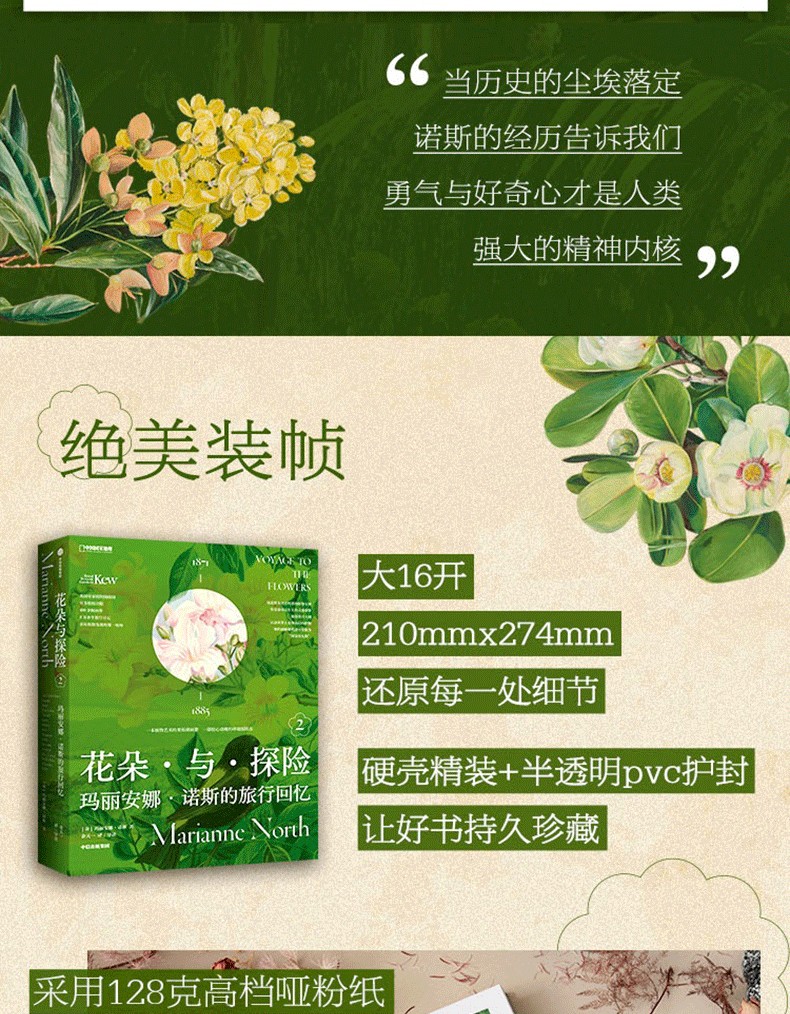 全書搭配近3萬字遊記,用第一視角記錄了她的全球探險經歷和植物發現之旅,兩本畫冊交相輝映,共同構成了瑪麗安娜·諾斯畢生科學探索和藝術成就的完整畫卷。她環遊世界六大洲,用細膩而豐富的筆觸,為我們探索、描繪了自然的神奇與壯麗,更用她的作品激發了人們對世界的好奇與熱愛,教育了一代又一代人去探索、珍惜這個多彩多姿的地球家園。