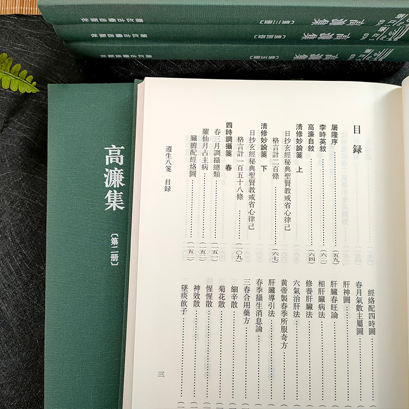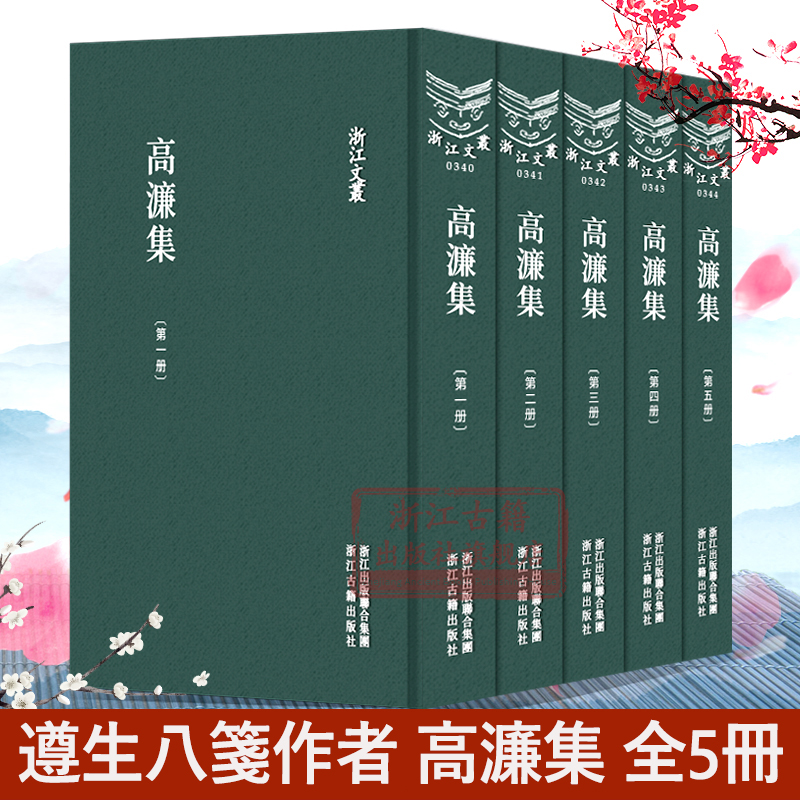 《高濂集(共5冊)》蒐集高濂所有著作,按《遵生八箋》、《芳芷棲詞》、《玉簪記》、《節孝記》、《散曲(小令和套數)》為序,總二十六卷。其中,《四時幽賞篇》全文已見於《遵生八箋》之《四時調攝箋》;又《雅尚齋詩草》已佚,故未能闌入。