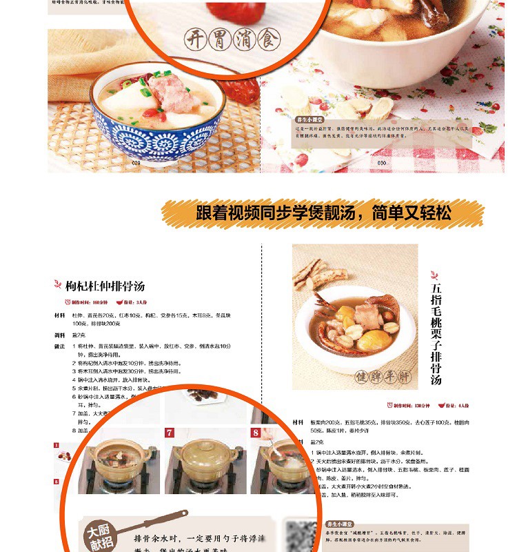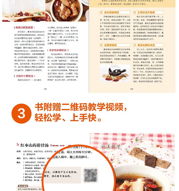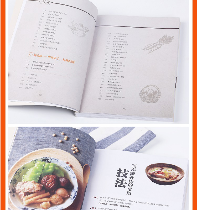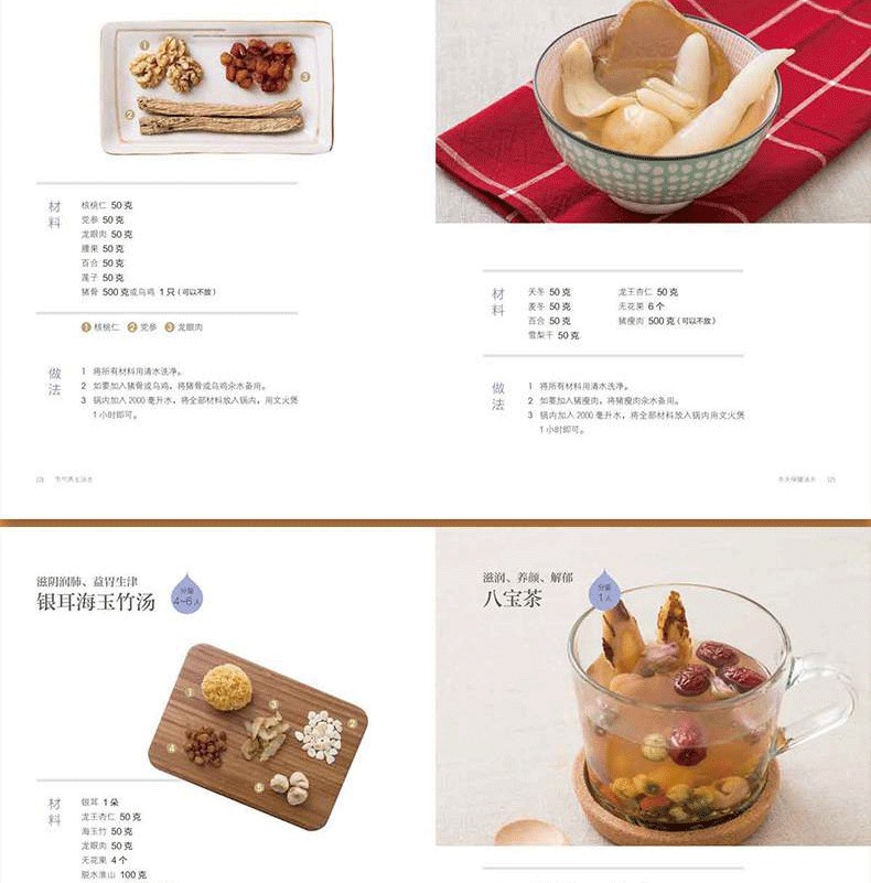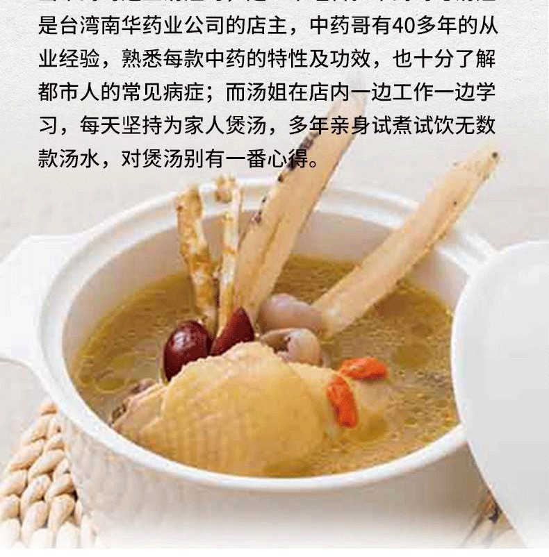 書中所提供湯膳,大都是家常湯,根據不同季節、不同人群、不同體質和各種疾病情況,適當加入了相應的中藥,以起到祛病防病的效果。湯膳中加入的中藥都是藥食兩用之品,取量精當,煲出的湯溫和中庸,無論是養生滋補,還是祛病防病,都可經常食用。
