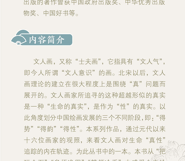 作者選擇了元代以來的黃公望、倪瓚、惲壽平、八大山人等十六位代表畫家,通過其文人畫作和藝術人生,全景勾勒文人畫的精神世界,探討文人畫的“真性”,並總結劃分了中國繪畫發展的三個不同階段:“得勢”“得韻”“得性”。 《文人畫的真性》語言明暢優美,不同於一般藝術史論的專業拗口,深具可讀性,作者致力精微卻又於細微處見知著,多有撥雲見月的妙論。