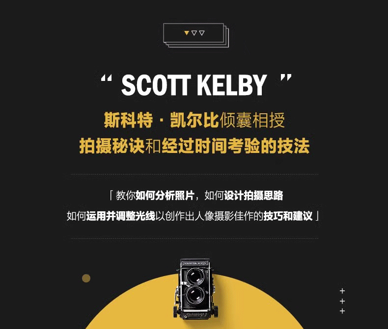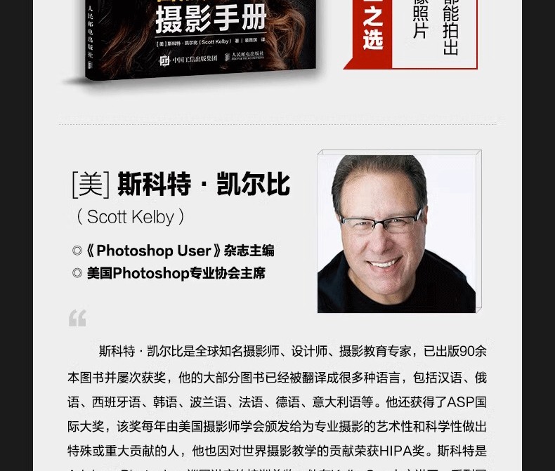 斯科特·凱爾比是 知名攝影師、設計師、攝影教育專家,已出版90餘本圖書並屢次獲獎,他的大部分圖書已經被翻譯成很多種語言,包括漢語、俄語、西班牙語、韓語、波蘭語、法語、德語、意大利語等。他還獲得了ASP 大獎,該獎每年由美國攝影師學會頒發給為專業攝影的藝術性和科學性做出特殊或重大貢獻的人,他也因對世界攝影教學的貢獻榮獲HIPA獎。斯科特是Adobe Photoshop巡迴講座的培訓總監,他在KelbyOne上主講了一系列網上課程,自1993年起就開始培訓攝影師和Adobe Photoshop用戶。