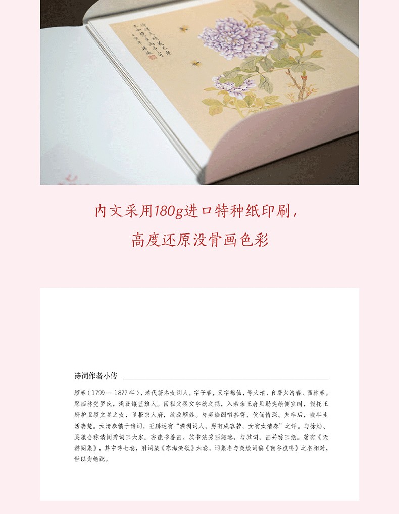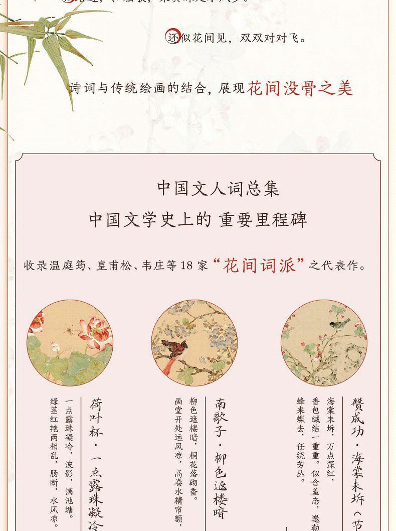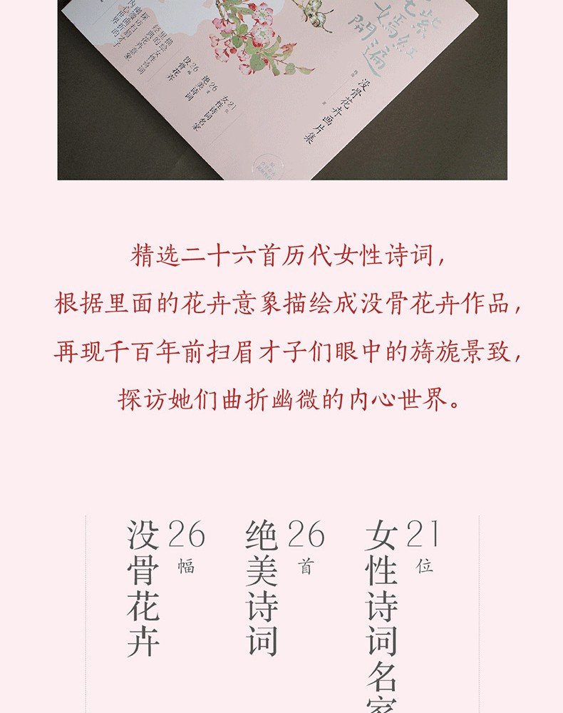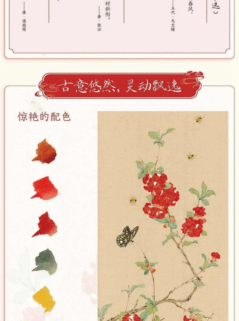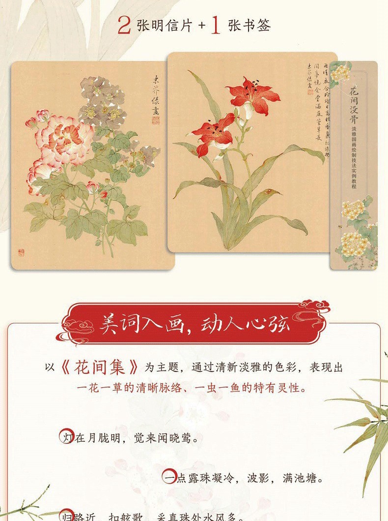 本書以《花間集》的詞作為主題,引出杏花、荷花、竹子、菊花、桂花、蝴蝶等 20 餘種常見動植物,透過詞與動植物的巧妙結合來展現沒骨畫的意境與趣味,並詳細介紹了沒骨畫的創作過程。