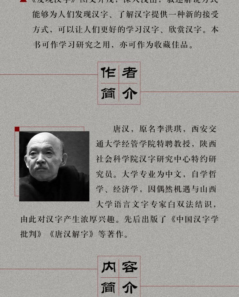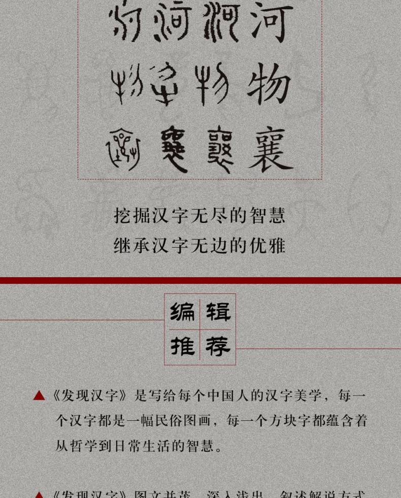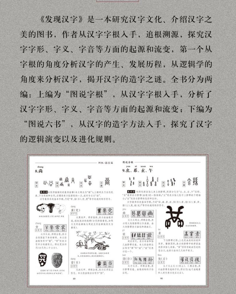 《發現漢字》是一本研究漢字文化、介紹漢字之美的圖書,作者從漢字字根入手,追根溯源,探究漢字字形、字義、字音等方面的起源和流變,*一個從字根的角度分析 漢字的產生、發展歷程,從邏輯學的角度來分析漢字,揭開漢字的造字之謎。 全書分為兩編:上編為“圖說字根”,從漢字字根入手,分析了漢字字形、字義、字音等方面的起源和流變;下編為“圖說六書”,從漢字的造 字方法入手,探究了漢字的邏輯演變以及演化規則。