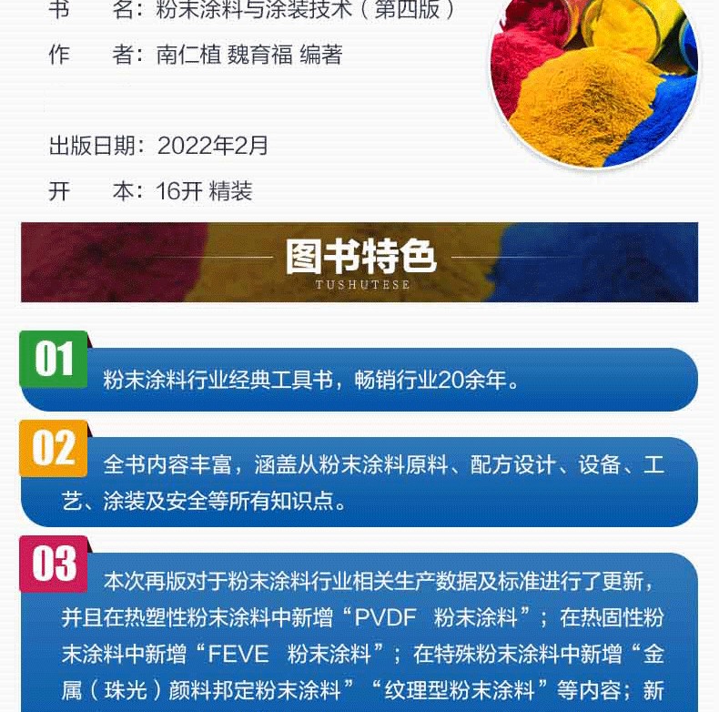 2.全書內容豐富,涵蓋從粉末塗料原料、設備、工藝、施工等所有知識點;