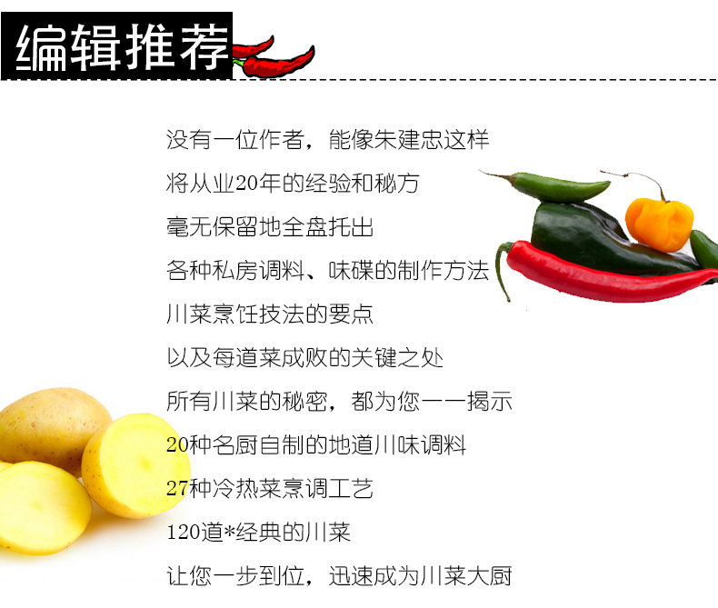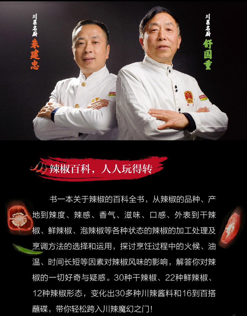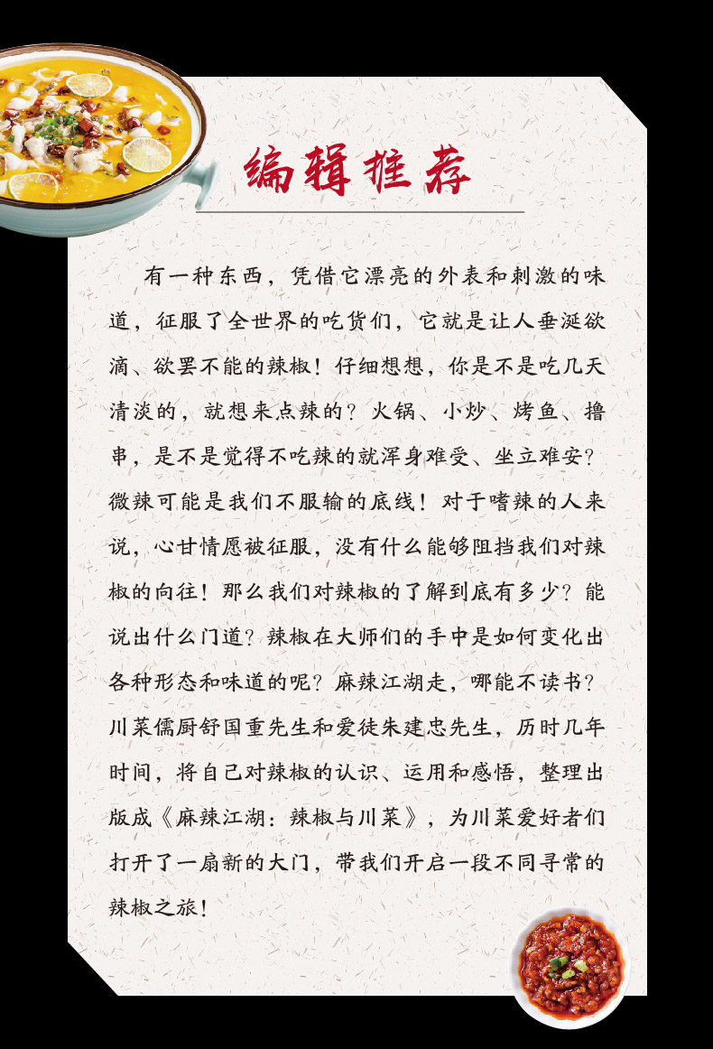 有一種東西,憑藉它漂亮的外表和刺激的味道,征服了全世界的吃貨們,它就是讓人垂涎欲滴、欲罷不能的辣椒!仔細想想,你是不是吃幾天清淡的,就想來點辣的?火鍋、小炒、烤魚、擼串,是不是覺得不吃辣的就渾身難受、坐立難安?微辣可能是我們不服輸的底線!對於嗜辣的人來說,心甘情願被征服,沒有什麼能夠阻擋我們對辣椒的嚮往!那麼我們對辣椒的了解到底有多少?能說出什麼門道?辣椒在大師們的手中是如何變化出各種形態和味道的呢?麻辣江湖走,哪能不讀書?川菜儒廚舒國重先生和愛徒朱建忠先生,歷時幾年時間,將自己對辣椒的認識、運用和感悟,整理出版成《麻辣江湖:辣椒與川菜》,為川菜愛好者們打開了一扇新的大門,帶我們開啟一段不同尋常的辣椒之旅!