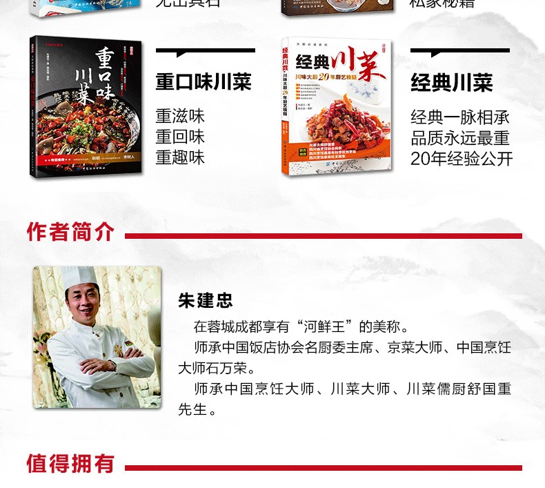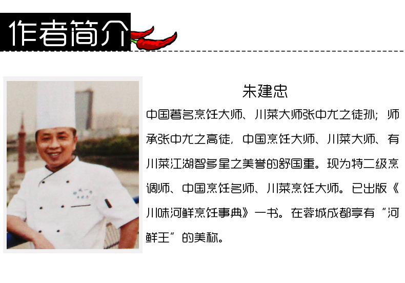 朱建忠,師承中國烹飪大師、川菜儒廚舒國重先生之門下,現為特二級烹調師、技師、中國烹飪名師;川菜烹飪大師;四川省烹飪協會會員,四川名廚委員會委員,四川省餐飲娛樂與飯店協會會員,已出版《川味河鮮烹飪事典》《重口味川菜》《經典川菜》等書籍,在蓉城成都享有“河鮮王”的美譽