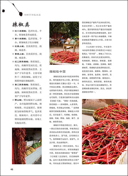 《麻辣江湖:辣椒與川菜》介紹了川菜常用辣椒以及特色辣椒的品種和特點,川辣多變的源頭和調味料的豐富滋味。書中詳細介紹了30種干辣椒+22種鮮辣椒+12種辣椒形態+16道百搭蘸碟+114道經典、新派、火爆川菜,是一本系統認識辣椒,學習川菜廚師使用辣椒的哲學與秘籍的書籍。