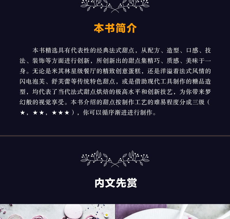 展現當代法式甜點烘焙的高水平和創新技藝,帶來夢幻般的視覺享受 45道顛覆感官的法國流行創意甜點,打造視覺和味覺的雙重饗宴 精選很具代表性的法式甜點款式,以傳統家常甜點和經典款甜點為基礎,從配方、造型、口感、技法、裝飾等方面進行創新,所創新出的甜點集精巧、質感與美味於一身。無論是米其林餐廳級的精緻蛋糕,還是洋溢著法式風情的閃電泡芙、舒芙蕾,或者藉助現代工具製作的糖品造型, 均代表了當代法式甜點烘焙的極高水平和創新技藝,都將帶來夢幻般的視覺享受。本書介紹的甜品按難易程度分成三級(★,★★,★★★),你可以循序漸進進行製作。