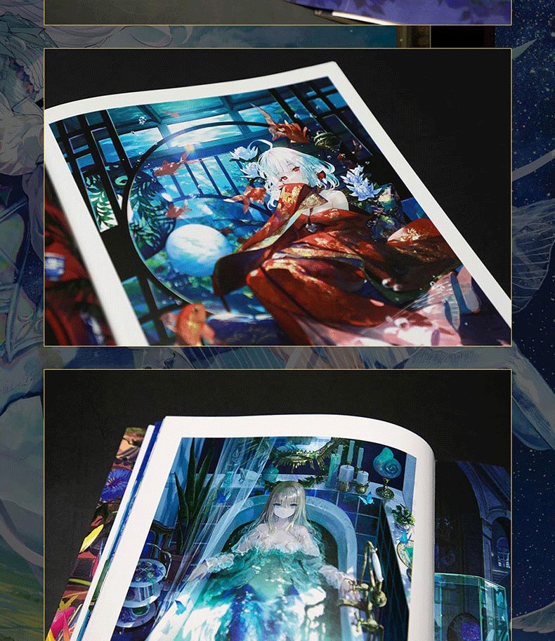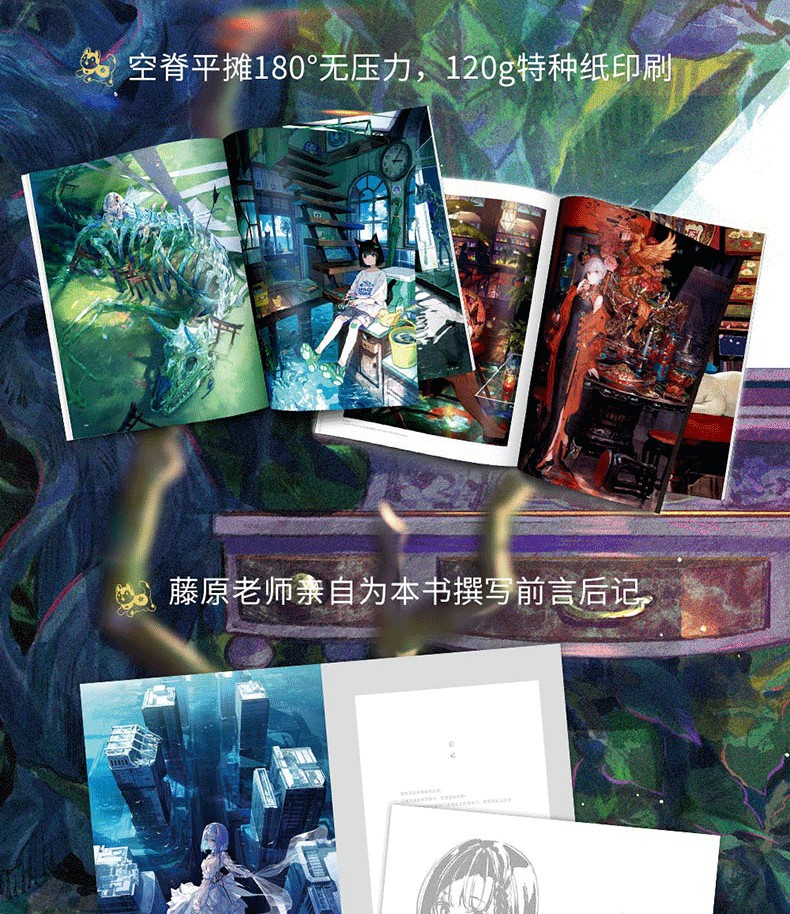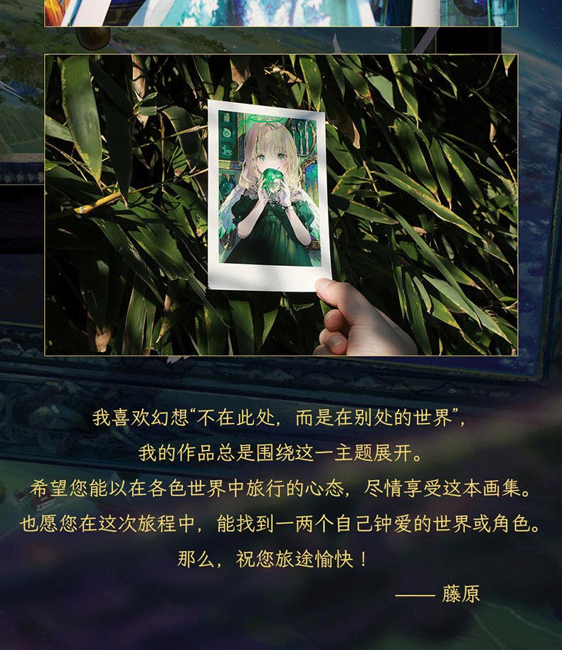 我喜歡幻想“不在此處,而是在別處的世界”,我的作品總是圍繞著這個主題。希望您能以在各色世界中旅行的心態,盡情享受這本畫集。也願您在這趟旅程中,能找到一兩個自己鍾愛的世界或角色。那麼,祝您旅途愉快! ——藤原