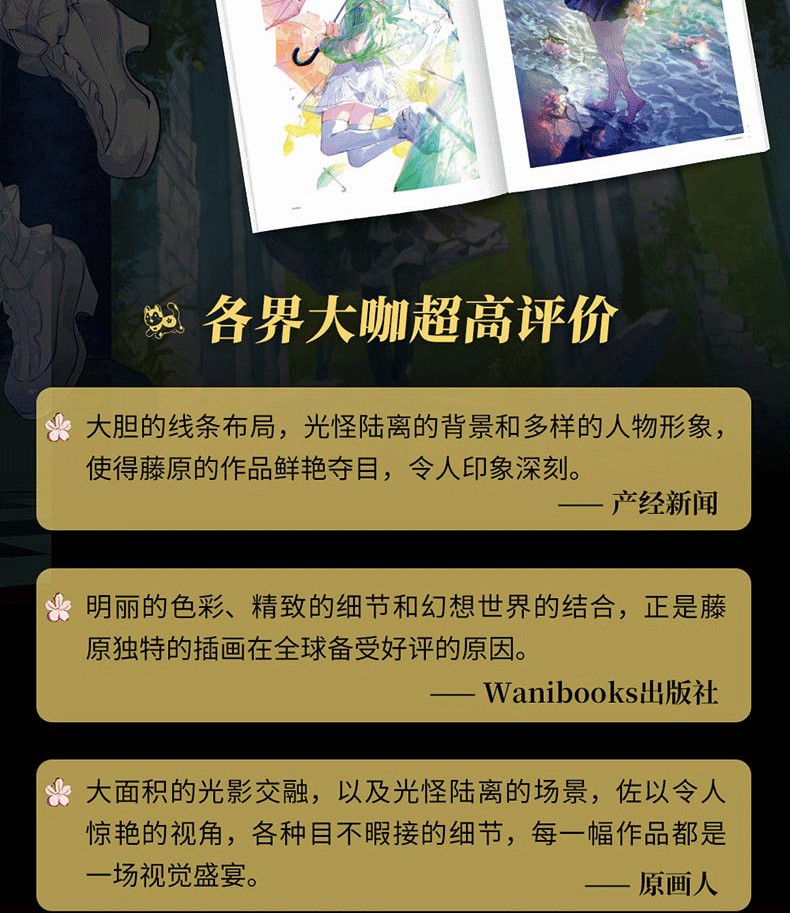 明麗的色彩、精緻的細節和幻想世界的結合,正是藤原獨特的插畫在世界上備受好評的原因。 ——Wanibooks出版社