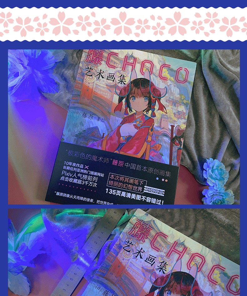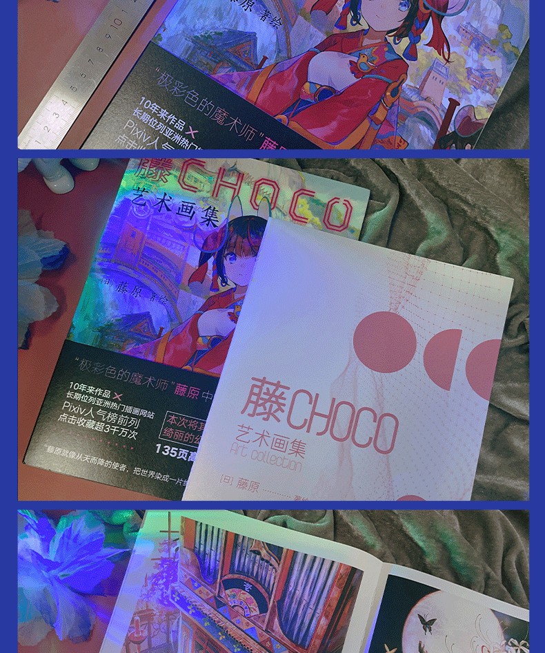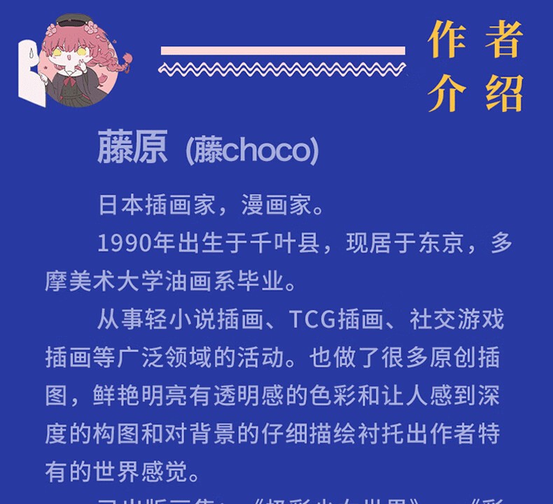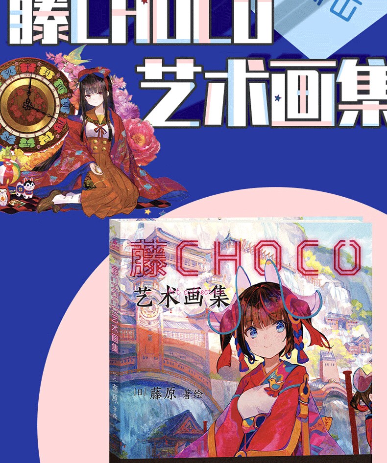 超人氣插畫家藤原以細膩流暢的筆觸、透明絢麗的色彩繪製出濃厚獨到的世界觀與故事意境,10年來作品長期位列PIXIV站人氣榜前列,點擊收藏超3千萬次!今年,藤原全新個人畫集《藤CHOCO藝術畫集》在中國閃亮登場!本次畫集除收錄藤原近年來的原創插畫和版權插畫之外,更有收錄早期經典插畫和參與中國項目所繪製的插畫作品,並且採用16開全彩精美印刷,裸背鎖線裝幀,能完整的展開每幅作品,觀感升級。此外,藤原專為畫集繪製了全新裝畫,邀請大家一起來走進她的幻想色彩世界!