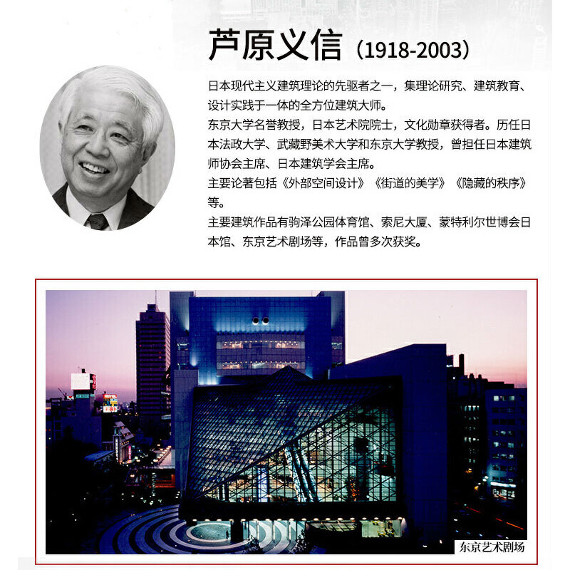 蘆原義信(1918—2003年),日本當代建築師,畢業於東京大學建築系、哈佛大學研究生院,歷任日本法政大學、武藏野美術大學和東京大學教授,曾擔任日本建築學會主席、日本建築師協會主席。著有《外部空間設計》《街道的美學》等書。