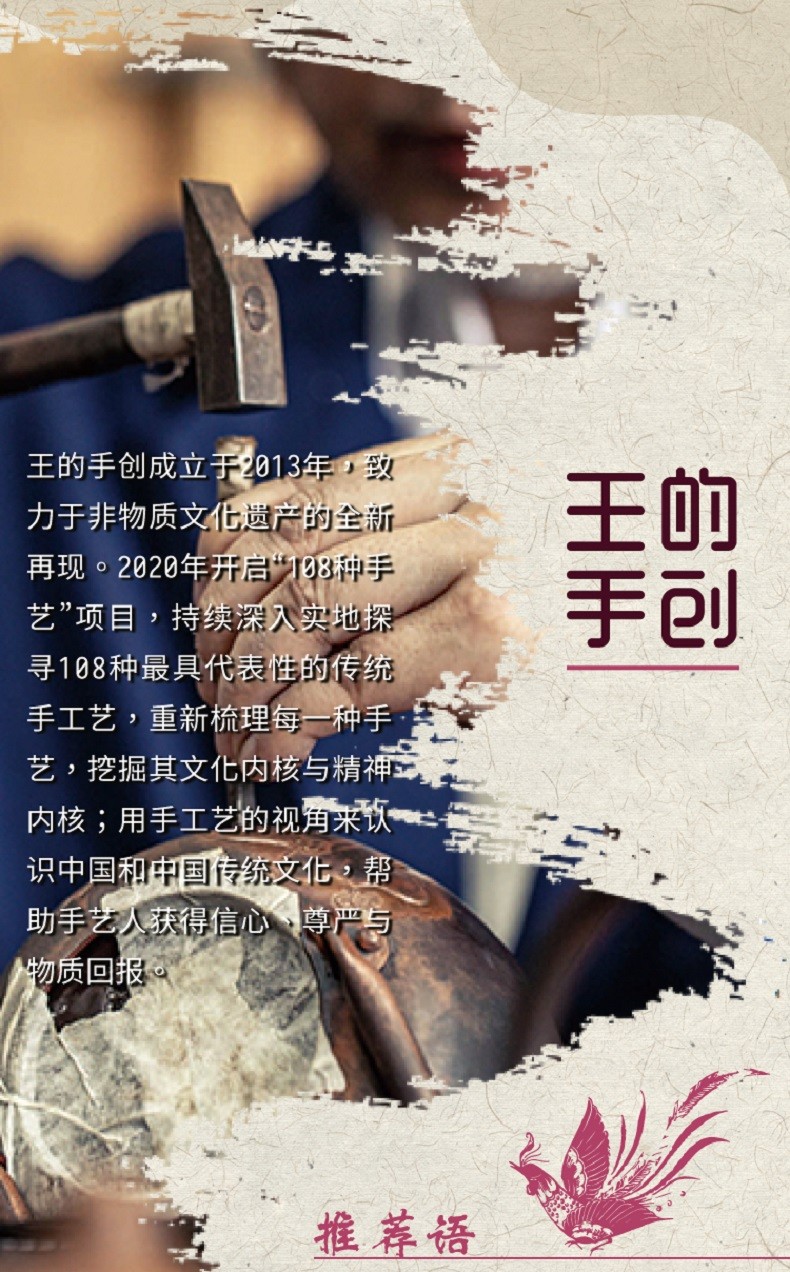 “王的手創”項目團隊,致力於弘揚中華傳統美學。自2020年開始,項目團隊開始在全國範圍內尋找非遺手藝人,通過尋訪吳國武、王家象、許關祥等,展示了中國非遺手工藝之美。核心成員王丹青,入選世界聯合國銀行頒布的“九位鼓舞人心的中國女性”。2023年7月成為首批登錄紐約聯合國總部的中國非遺文創品牌。自2020年起,項目組持續赴中國各地親身實地調研走訪,計劃推出三輯,共108種手藝。每一輯各38種。目前項目組已進行了68種手藝的調研及資料整理,涉及浙江、貴州、雲南、陝西、安徽、河南、江西、福建、山東、江蘇等多個省市自治區,從金屬器、陶瓷、竹木工藝、刺繡布藝、黃酒、茶葉等方面詮釋中國人的生活智慧與內在精神。所有的調研整理計劃,在2027年完成。期間,陸續推出三輯圖書。