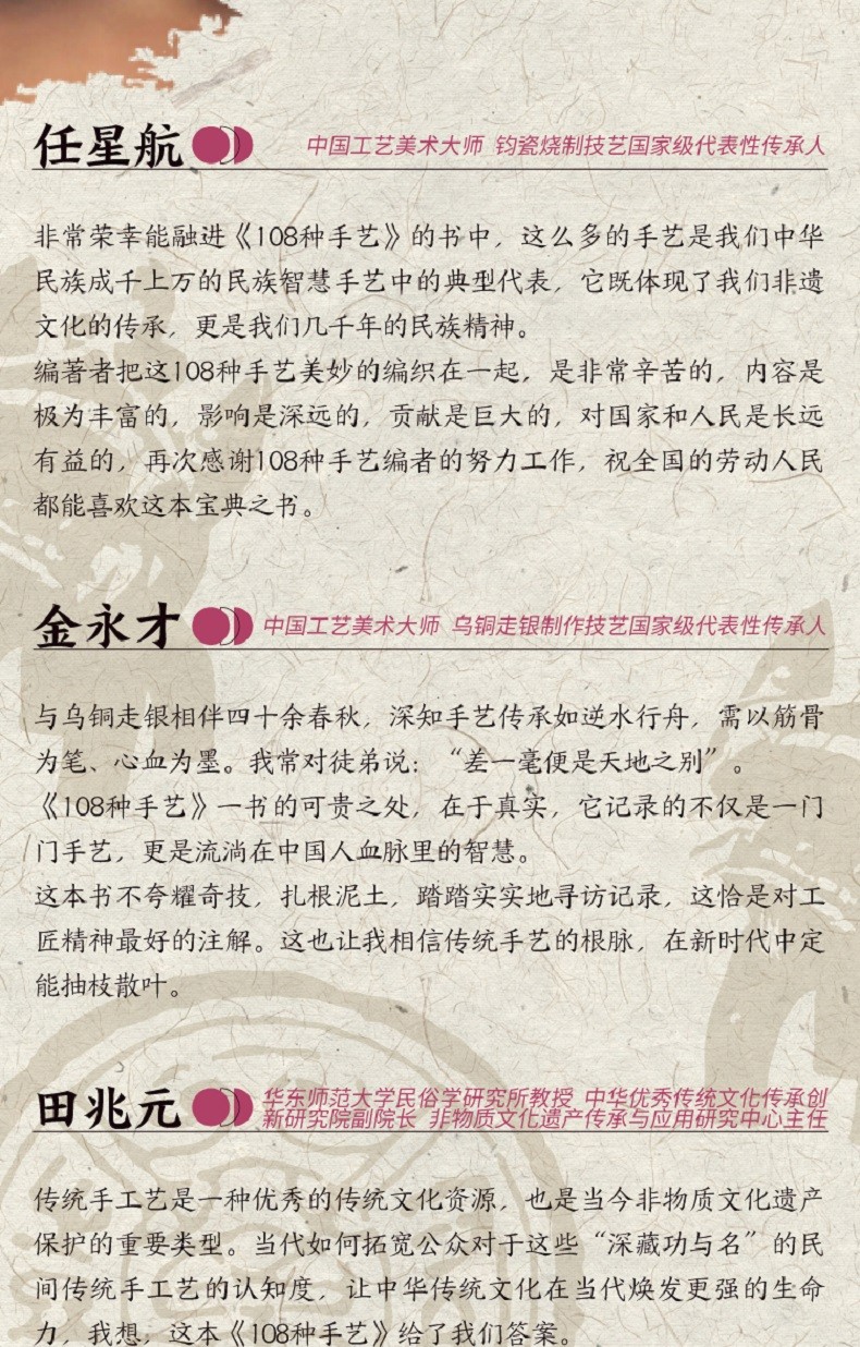《大美非遺:108種手藝》共分三輯,通過尋訪108位手藝人,展示了108種涵蓋了從傳統到現代的多種技藝,如苗綉、木雕、鈞瓷、古法造紙、制筆、油紙傘等,展現了中國人民的智慧和創造力。通過本書,可以讓讀者領略到非遺文化中凝聚着中華民族深層次的文化基因,是人類生命的記憶,是人類創造力的精神源泉,是人類智慧的結晶,是人類永恆的精神家園。