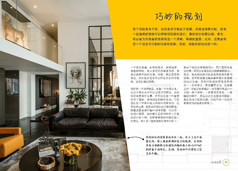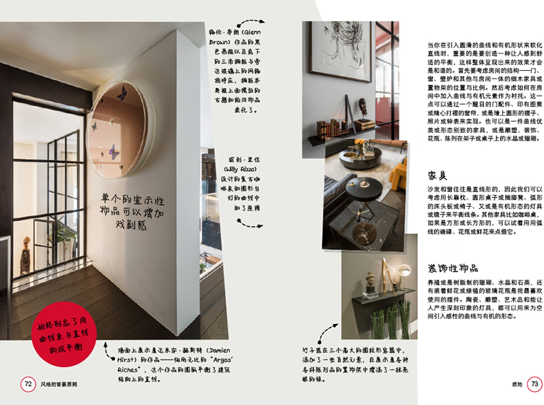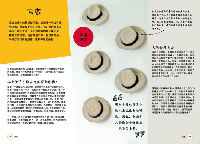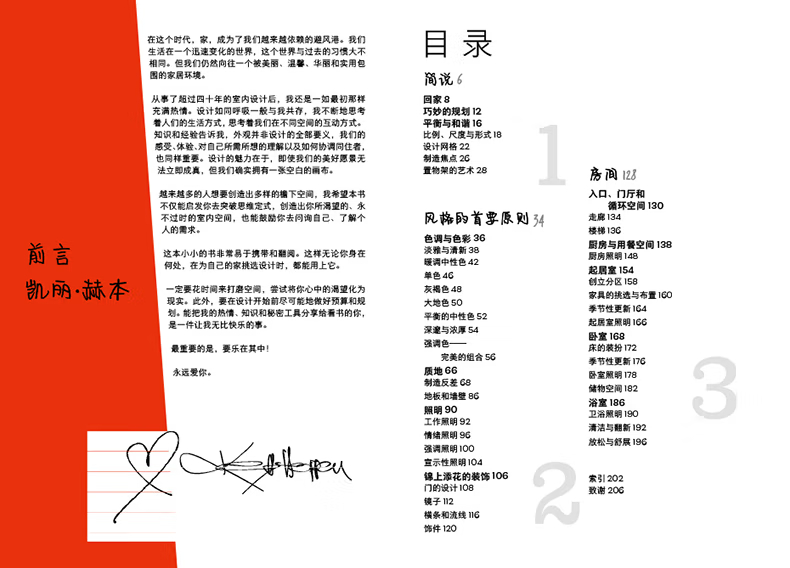 第一部分導入部分在書的第一部分,凱莉赫本介紹了一些實用技巧。除此之外,她還向讀者們拋出了一個重要的問題:“家對你來說意味著什麼?”在風格方面,凱麗赫本崇尚“平衡”與“和諧”,她喜歡在平靜的空間加入張力。在設計上,她也勇於嘗試不同的搭配,對稱和對比都是她經常使用的一些設計技巧。同時,赫本也注重各部分的比例和形式,還有各種家具的擺放,有時她也會靈活運用設計網格。