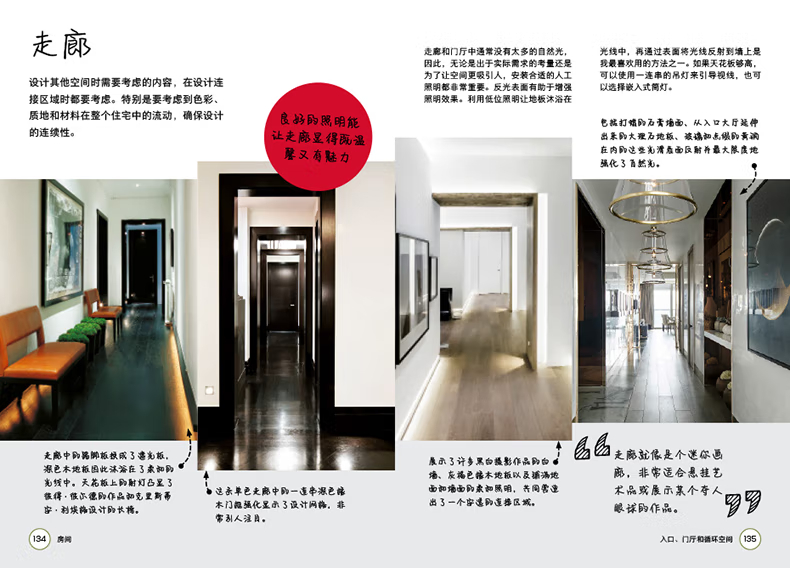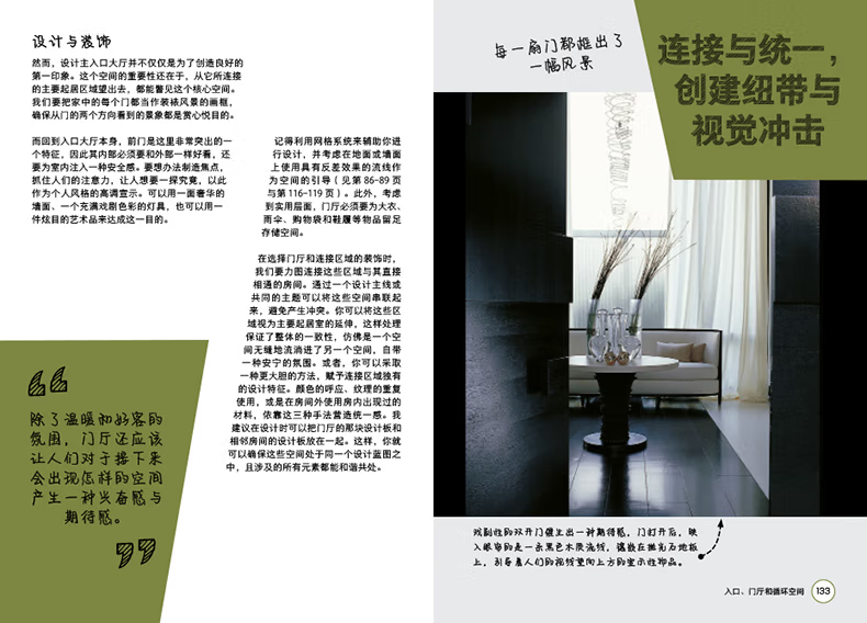第三部分.各房間的設在這一部分,凱莉赫本將上述設計原則和裝飾元素運用到不同空間的設計中。講述在入口、走廊與流通空間、臥室、餐廳等空間的設計