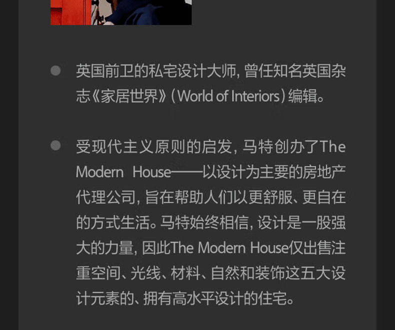 2005年,私宅設計大師馬特·吉伯特為了讓人們 好地體會設計的強大力量而創立了The Modern House——以設計為主dao的房地產代理公司。 The Modern House同時也是出版商和生活方式品牌,僅出售擁有好設計的房屋,鼓勵並幫助人們在家中發現美,透過平衡設計要素找到適意的現代生活方式。