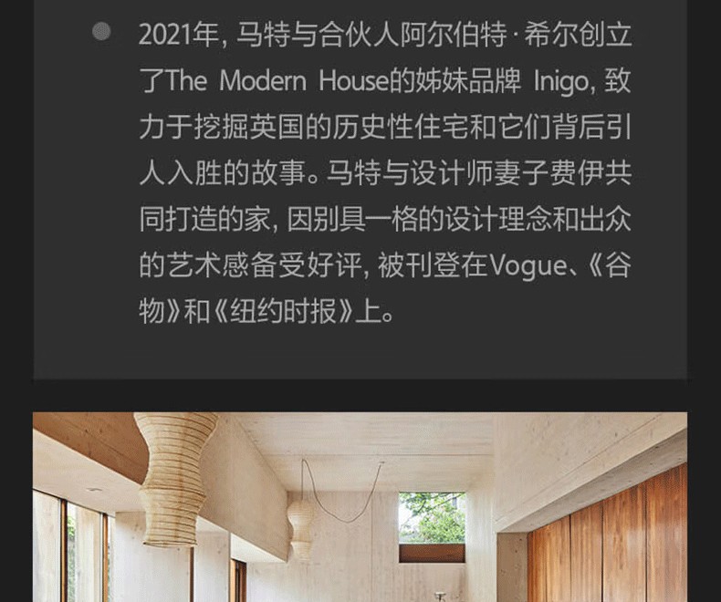 2021年,馬特與合夥人阿爾伯特·希爾創立了The Modern House的姊妹品牌 Inigo,致力於挖掘英國的歷史性住宅和它們背後引人入勝的故事。馬特與設計師妻子費伊共同打造的家,因別具一格的設計理念和出眾的藝術感備受好評,被刊登在《Vogue》、《穀物》和《紐約時報》上。