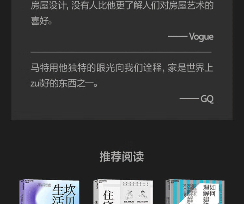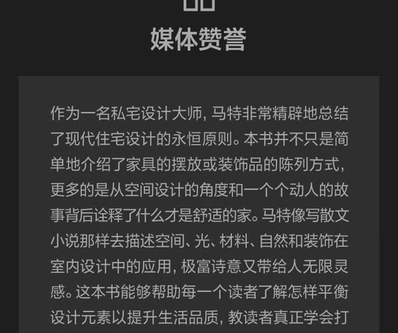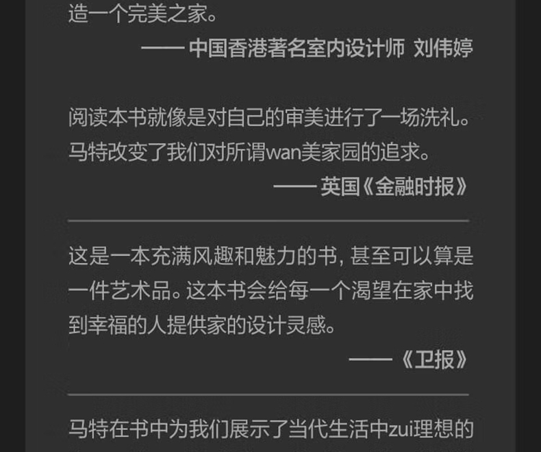 搭配著大量令人驚嘆的攝影作品,馬特向我們講述了那些擁有非凡設計的生活空間及其同樣不凡的房主的故事,並深刻詮釋瞭如何將空間、光線、材料、自然和裝飾這五大要素應用於房屋設計和室內空間。設計對於房屋和居住者的意義是什麼?透過設計,我們可以找到自己zhen正喜歡的風格,找到燈光、顏色、材質的獨特搭配,房屋設計才會展現出持久的魅力,並成為獨屬於自己的wan美之家。這樣,我們才能zhen正在家中體會精神的愉悅。