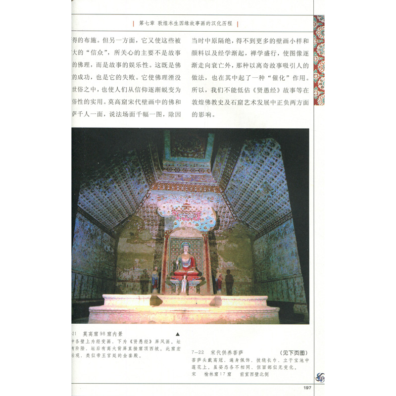 中國佛教美術留下了無數的遺跡、遺存和遺物,但歷史上諸多古剎名寺因戰火、天災、人禍而灰飛煙滅,寺廟建築中的佛教藝術也隨之消失殆盡。唯開鑿於山崖的佛教石窟寺雖歷經滄桑,仍大多得以保存。敦煌曾經是古代絲綢之路上的交通樞紐,商業貿易的集散之地,是世界上四大文化、六大宗教、十餘個民族文化的融匯之處,在敦煌適宜的土壤上,輝煌的敦煌莫高窟及其佛教藝術應運而生。敦煌莫高窟迄今保存了735個洞窟、45000平方米壁畫、2000多身彩塑、5座唐宋窟檐。敦煌莫高窟是中國現存規模的佛教石窟寺遺址,是世界上歷史延續悠久、保存完整、內容豐富、藝術精美的佛教藝術遺存,代表了公元3至14世紀中國佛教美術藝術的高度成就。