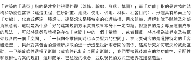 「建築的『造型』指的是建物的視覺外觀(線條、輪廓、形狀、構圖);而『功能』指的是建物的結構和功能性需求(建造工程、住所計畫、組織、使用、佔地、材料、社會目的)。能』,代表或傳達一種想法。是引導至這個成果的想法」。建築形體可以被視為存在「空間」中的一個「量體」,或者相反,將其視為被界定及被框架包含的一個「空間」、「一個向外推擠同時也承受壓力的空間」 。在此要研究的是選擇特定的“容器造型”,與針對其包含的量體所採取的進一步造型設計兩者間的關係,逐案研究如何取決於彼此互動。一旦基於感性選擇了形體(或條件已製定某固定形體),我們要檢視後續有助於功能性、分配性和技術性方案的規劃,運用簡單、已驗證的概念,並以現代的方式正確界定建築造型。