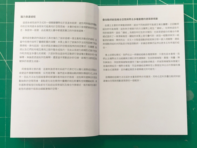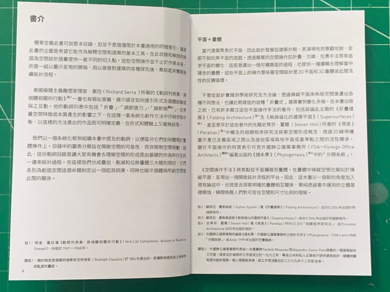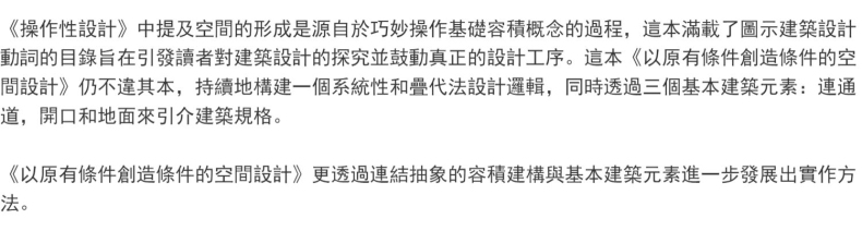 本書策劃靈感來自於對建築教育獨特的觀點,希望它能作為解釋空間和建築的基本工具。在建築碩士研究所課程中,傳授學生從設計研究課程以及工作室的創意工藝,發掘建築教育當中探討的一種「設計作為」主題—所謂「空間操作」。提供一個無限可能性的空間探索平台,作為脫離校園、邁出社會繼續學習的參考。