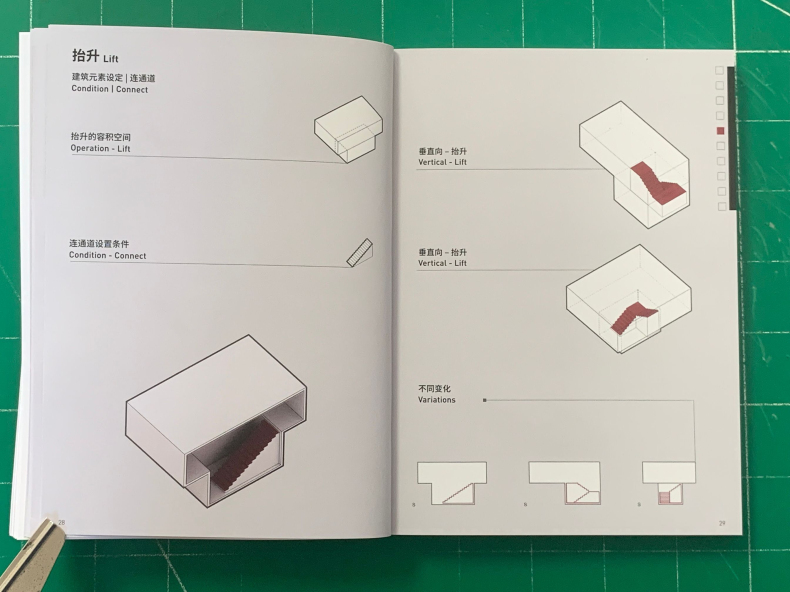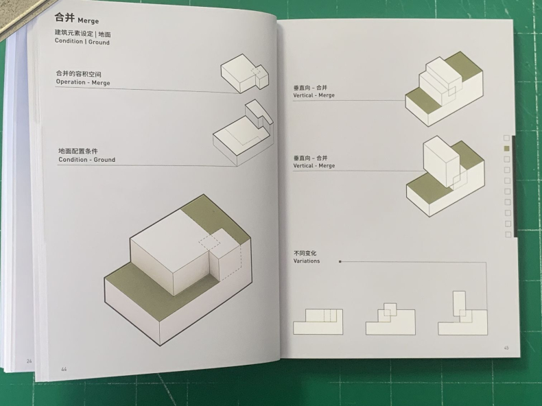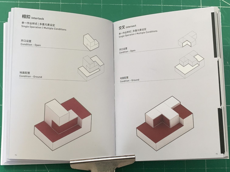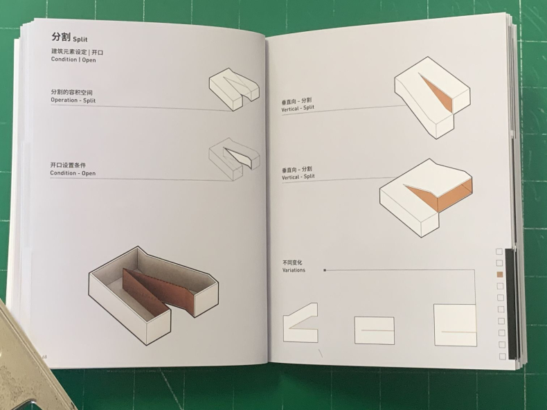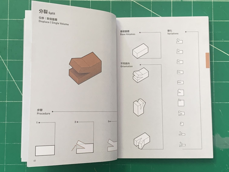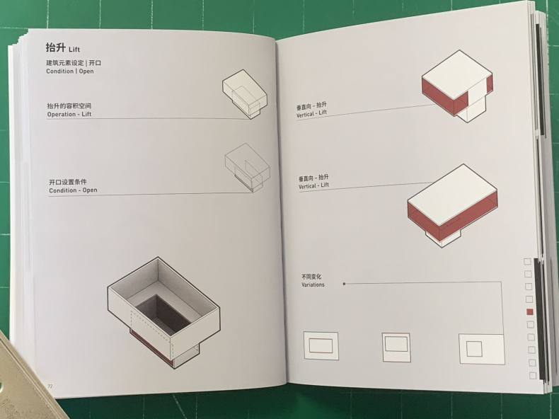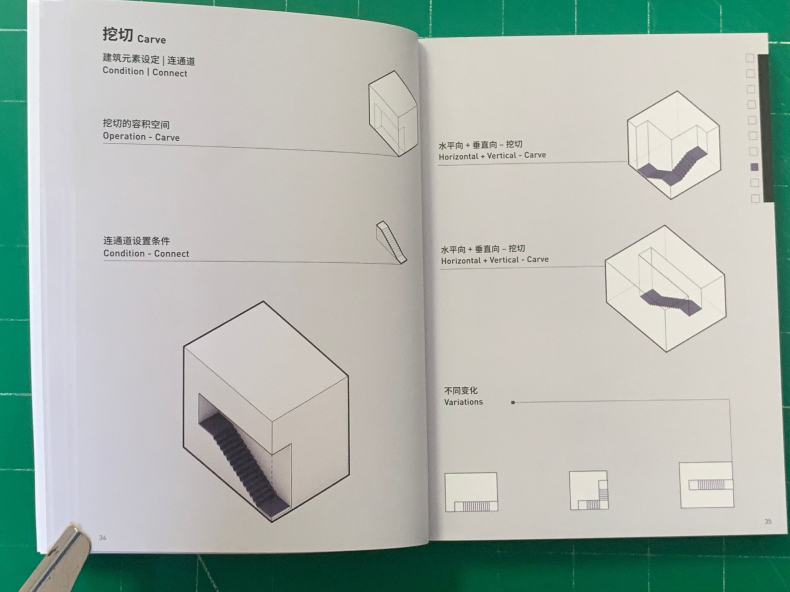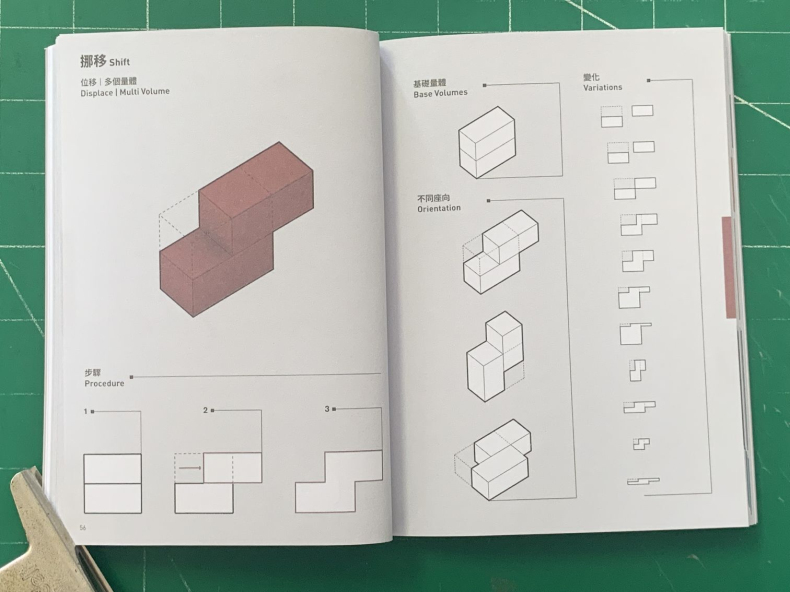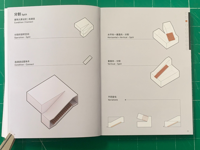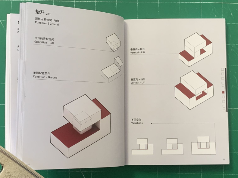 書中舉例說明的「空間操作」術語,在於發現以空間操作為第一步設計項目,能讓學生將他們的概念想法和「日常觀察」轉化為他們新的建築空間語言。於建築計畫之前的設計思維,導入空間的用途定義。藉由帶入一個作業術語,學生能針對「容積關係」、「親近性」、「鄰接感」和「體驗因素層面」展開研究,而不受對於原先空間先入為主的概念所拖累。隨著設計過程,賦予建造不同建築類型及參與的建築規劃作業。當建築序列開始呈現於抽象的空間作業時,細節也紮根落實於更迷人和有趣的結構中。