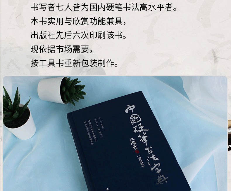 《中國硬筆書法字典(修訂版)》是《國家通用語言文字法》頒布實施後的一部硬筆書法工具書,實用功能強大,楷、行、隸、草、篆、魏碑、繁七種字體,可滿足人們查字、識字、習字等全方位需求,堪稱我國硬筆書法類圖書中的典範之作。