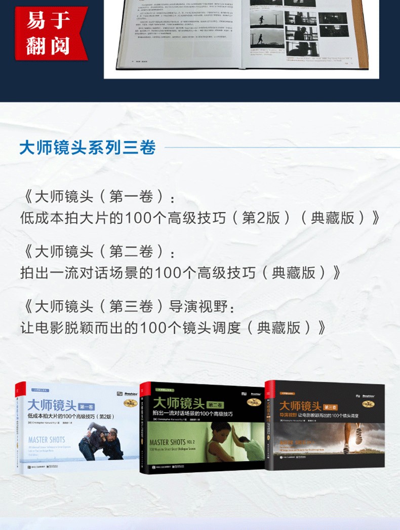 本書是“大師鏡頭系列”的最新力作,作者秉承了該系列深入淺出、圖例明晰的寫作特點,從攝影機運動、布景設計以及場景調度等方面為讀者梳理了100個經典案例,以達到讓電影脫穎而出的神奇效果。“大師鏡頭系列”前兩卷側重於故事情景設計,而本書作為前兩卷的升級版,講解更多的是對片場工作的還原和提煉。每個章節基本上概括了拍攝過程中的某個重要環節,例如鏡頭的選擇、縱深的調度、布景設計、取景與構圖等。讀者既可以選擇通讀全書,也可以選擇將本書帶在身邊,作為技術手冊隨時進行翻閱。