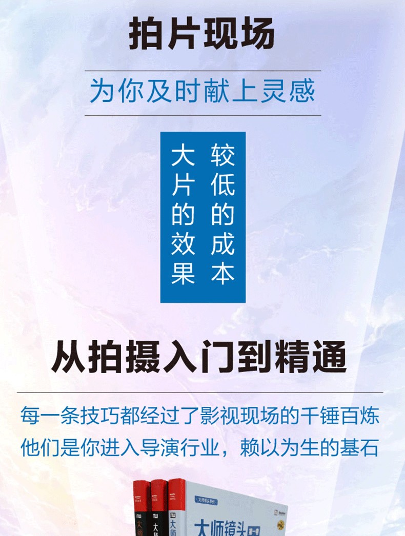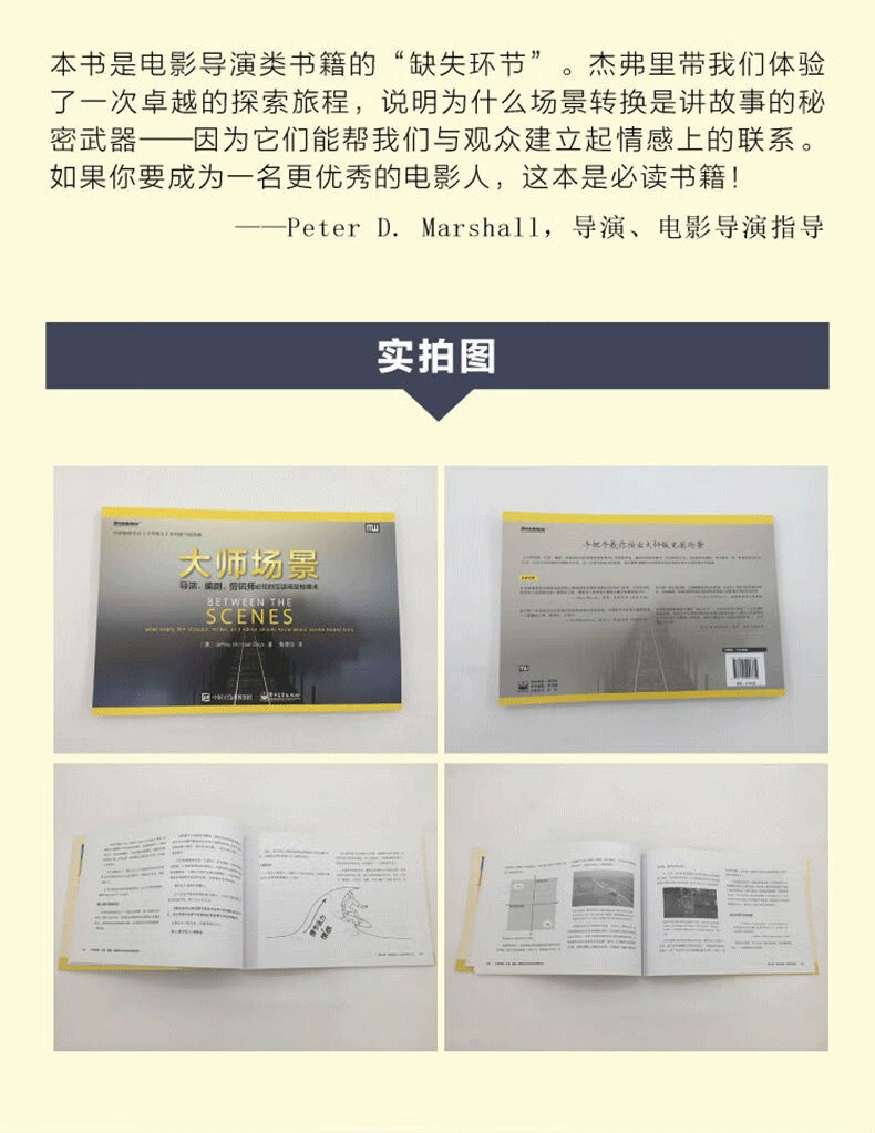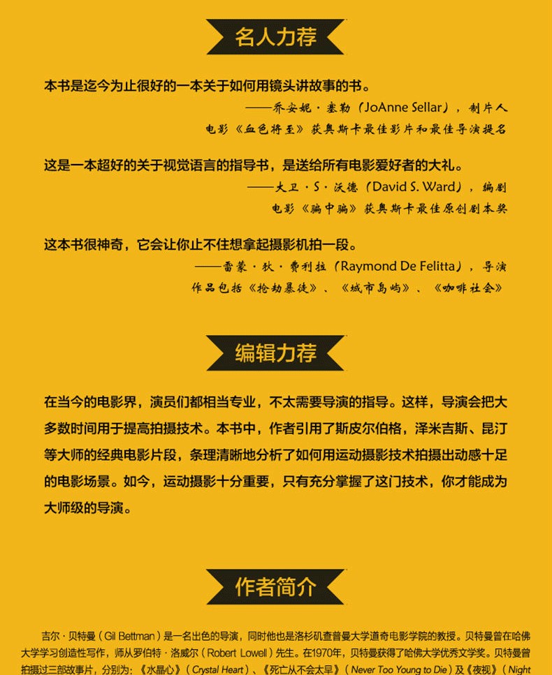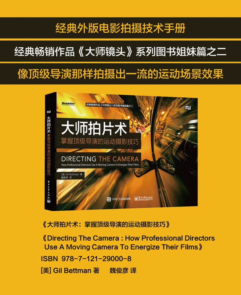 這本書能給你靈感,讓你有衝動去嘗試那些複雜的、創意十足的鏡頭。書中引用的例證全都來自大片,那些設備是你買不起的,錢也是你花不起的,但沒關係,我們就是想告訴你,只要一台手持攝影機,你也能拍出同樣驚豔的效果。這些技巧並不能馬上讓你成為優秀的導演,但瞭解它們,你才會知道電影怎樣拍才有效果。