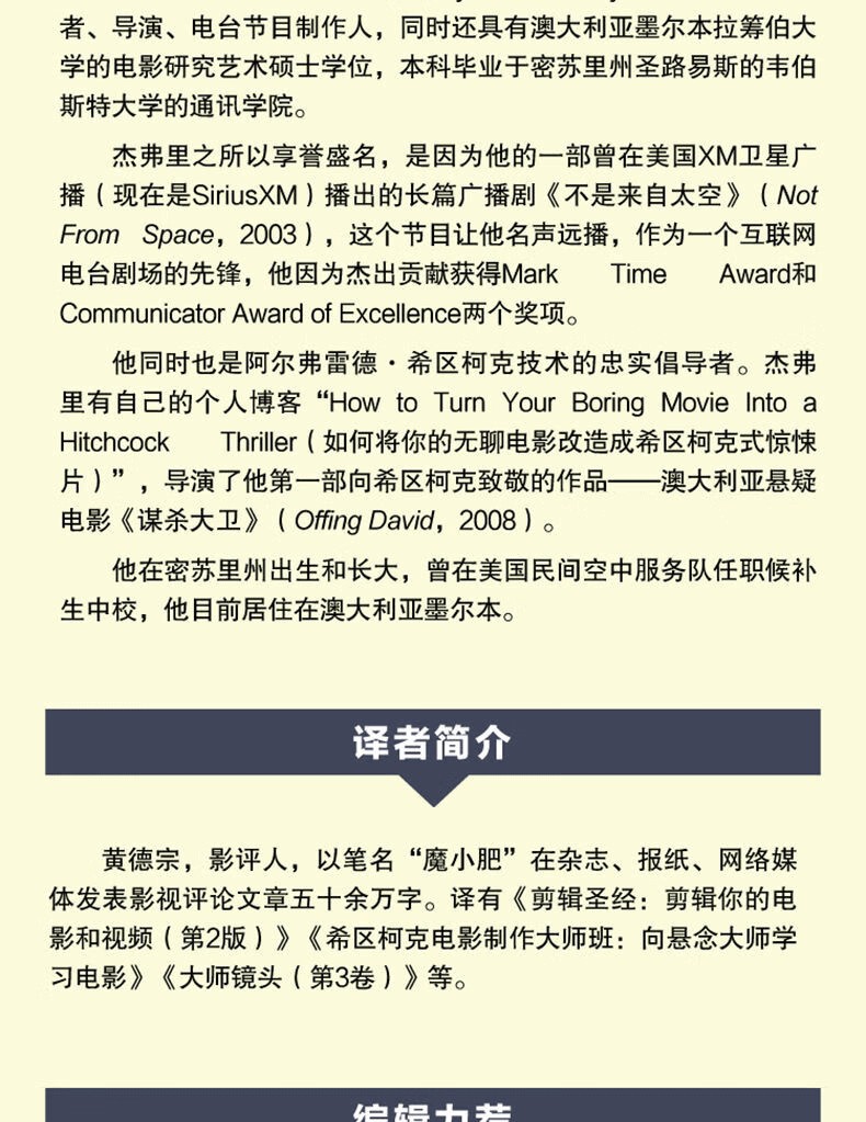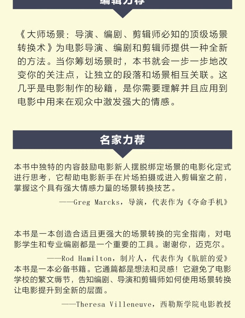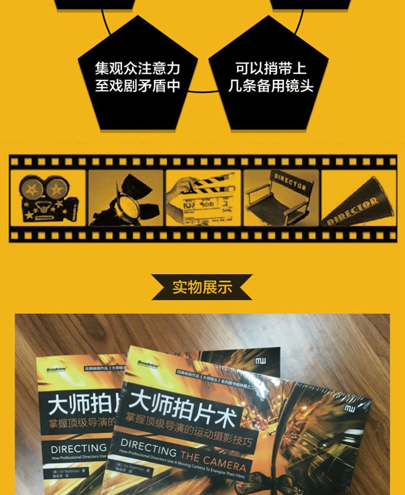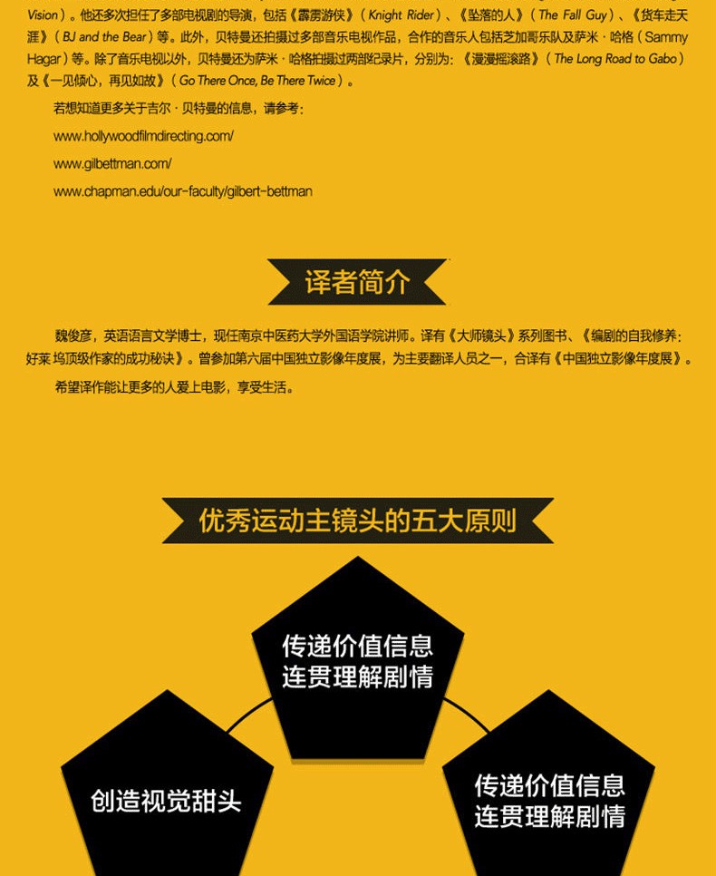 這本書能給你靈感,讓你有衝動去嘗試那些複雜的、創意十足的鏡頭。書中引用的例證全都來自大片,那些設備是你買不起的,錢也是你花不起的,但沒關係,我們就是想告訴你,只要一台手持攝影機,你也能拍出同樣驚豔的效果。這些技巧並不能馬上讓你成為優秀的導演,但瞭解它們,你才會知道電影怎樣拍才有效果。