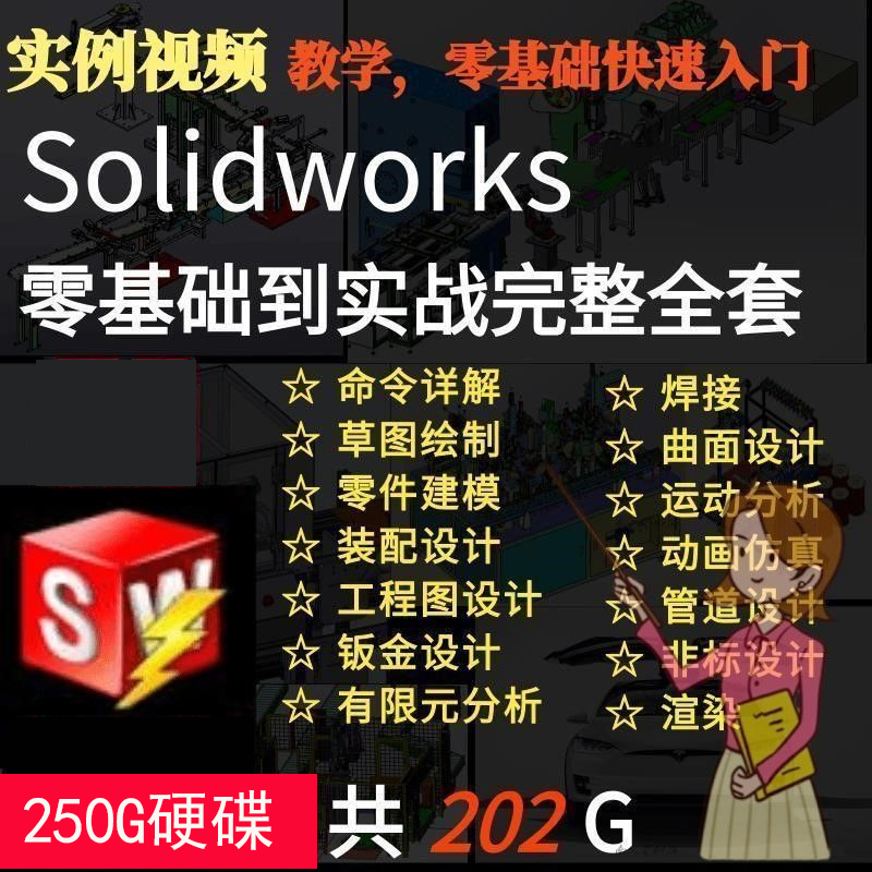 SolidWorks全套影片教學 零基礎自學 從入門到精通 指令詳解 草圖繪製 零件建模 組裝設計 工程圖設計 鈑金設計 有限元素分析 焊接 曲面設計 運動分析 動畫模擬 管路設計等(250G硬碟出貨 無需下載 即插即看 手機電腦都能永久觀看)