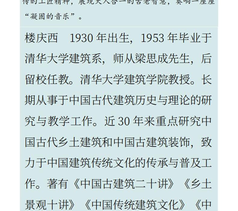 樓慶西,1930年出生,1953年畢業於清華大學建築系,師從梁思成先生,後留校任教。清華大學建築學院教授。長期從事於中國古代建築歷史與理論的研究與教學工作。近30年來重點研究中國古代鄉土建築和中國古建築裝飾,致力於中國建築傳統文化的傳承與普及工作。著有《中國古建築二十講》《鄉土景觀十講》《中國傳統建築文化》《中國古建築磚石藝術》《屋頂藝術》《中國古建築裝飾五書》等著作。
