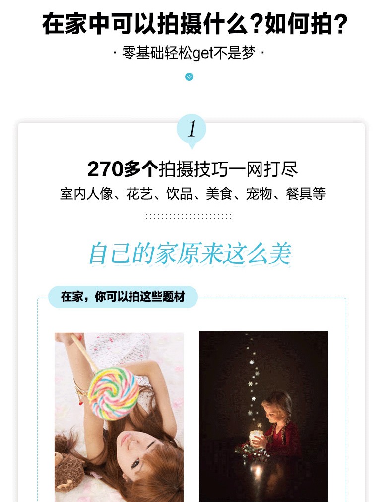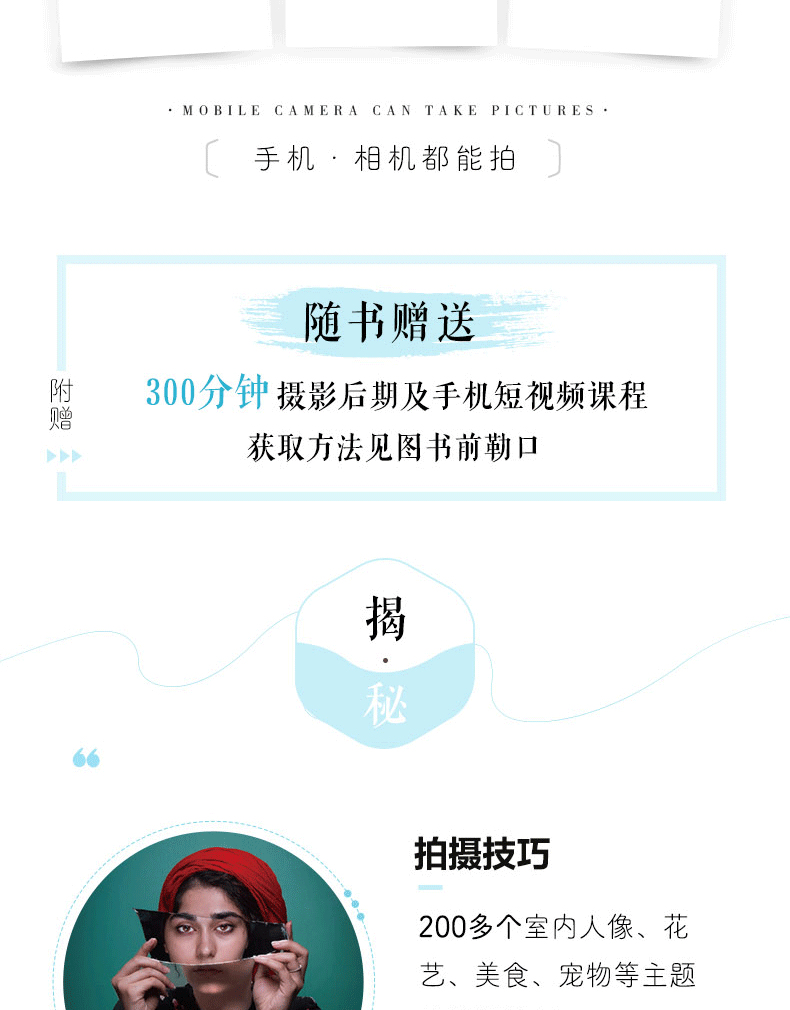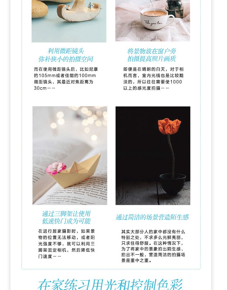 本書從拍攝思路、基礎理論、實拍技巧、創意實拍案例、手機視頻錄製幾大方面詳細介紹了居家攝影的拍攝技巧,解決居家拍攝的兩個核心問題——居家中可以拍攝什麼以及場景拍。本書全景了在家中可以拍攝的花藝,包括室內人像、美食、寵物、巧克力等。作者將每個畫面描繪為幾個具體的場景場景,介紹270多攝秘訣,希望還有幫助的讀者拓寬思路,找到自己的提升攝影水平的方法,拍攝攝影的關鍵無法看到多美、器材多貴而看拍攝者的想法與創意。此外,圖書詳細的時下流行的Vlog視頻拍攝及介紹化妝美容技巧,幫助用戶輕鬆拍出抖音、快手等平台上高讚、高點擊率的視頻作品。本書適合熱愛美、熱愛生活的攝影愛好者。參考閱讀。通過學習本書,讀者可以掌握海量居家攝影盡享攝影的實用拍攝技術,將隨身攜帶之物拍的日常美感,帶來藝術美感。