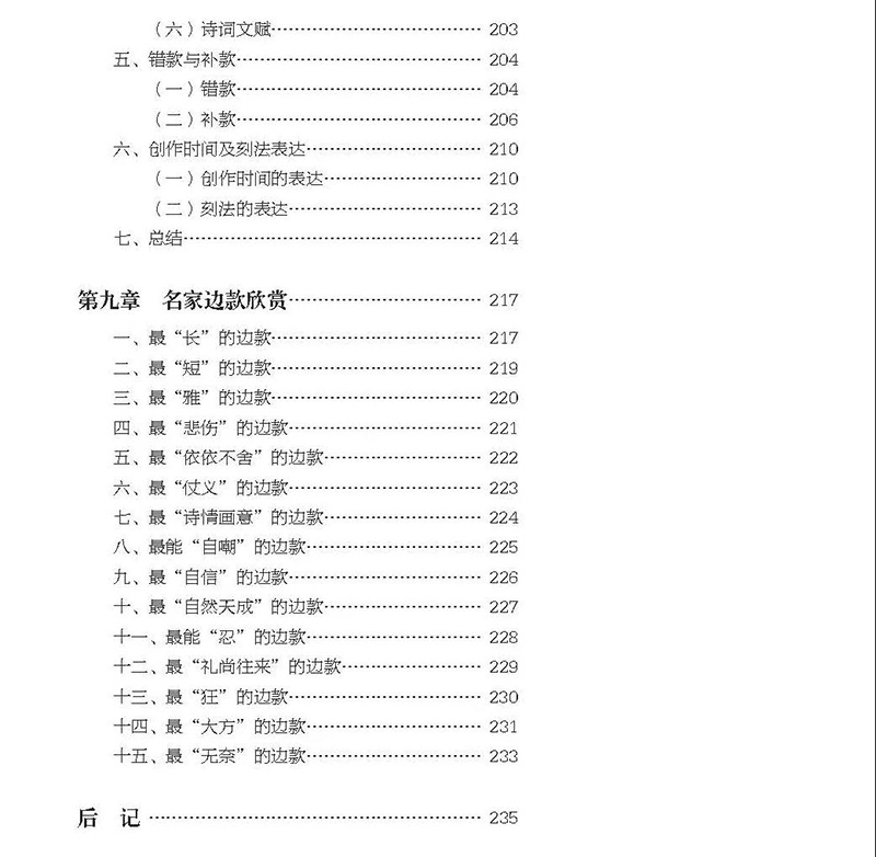《單刀楷書邊款刻法與創作》不僅是一本“邊款字帖”,還是一本專業的邊款創作指南,書的後四章分別講述邊款的章法與風格、邊款的方向、邊款的語言,以及名家邊款欣賞等內容。