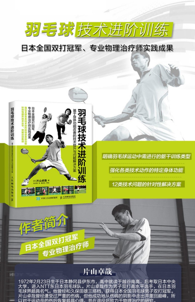 片山卓哉,1972年2月23日生於日本靜岡縣伊東市,高中就讀於越谷南高,後考取日本中央大學,進入NTT東日本羽毛球隊。片山卓哉作為男子雙打高水平選手,在日本羽毛球界頗具名氣。他曾經和久保田雄三搭檔,獲得日本全國羽毛球男子雙打優選。片山卓哉曾經遭受過嚴重的傷病,但他成功地從傷病的陰影中走出並重回很好,所以對於運動員的傷後恢復頗具心得,並在退役後致力於物理治療的研究。片山卓哉主要從事羽毛球、棒球、乒乓球等專項運動員的體能訓練及損傷預防的指導工作。他不僅在日本靠前進行演講,還通過博客、Facebook等社交媒體,向運動員以及業餘愛好者普及這方面的知識。作為一名高水平的運動員,同時也作為一名專業的理療......