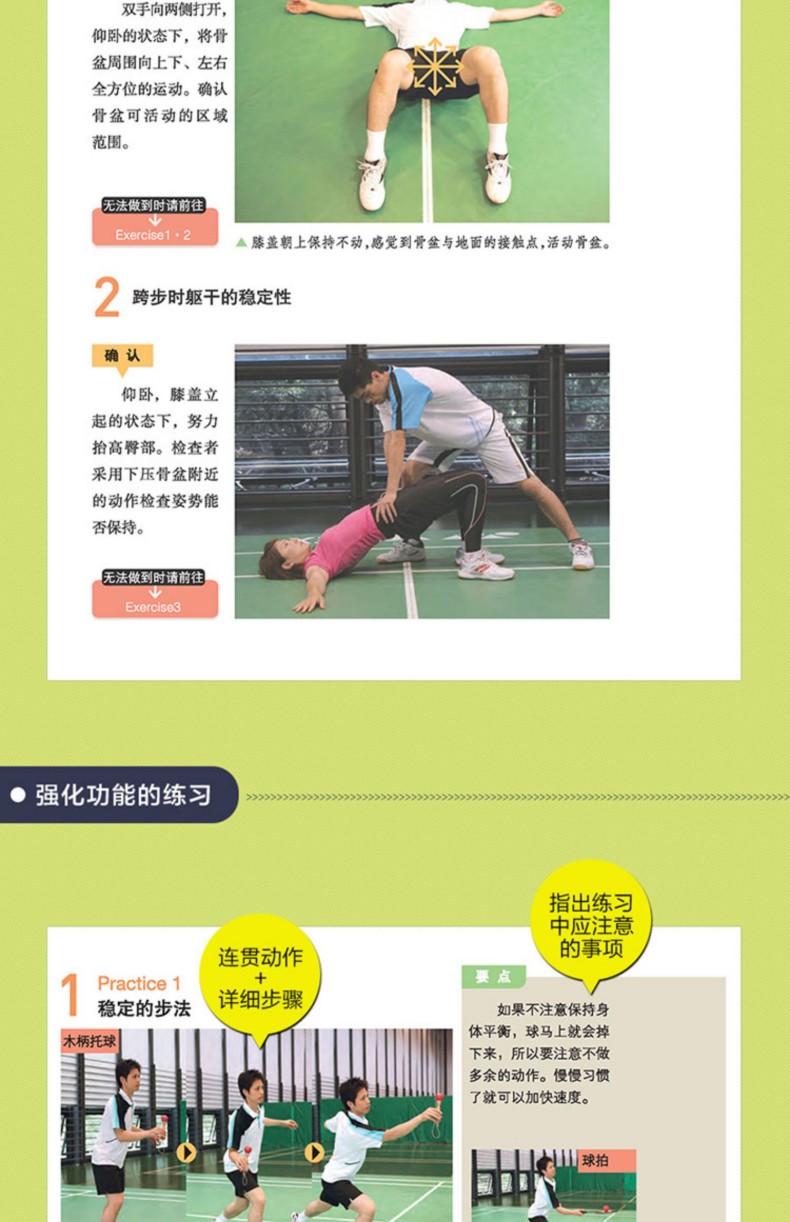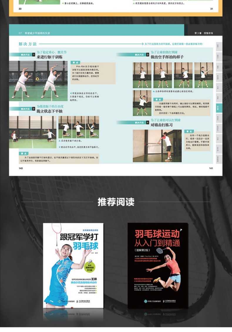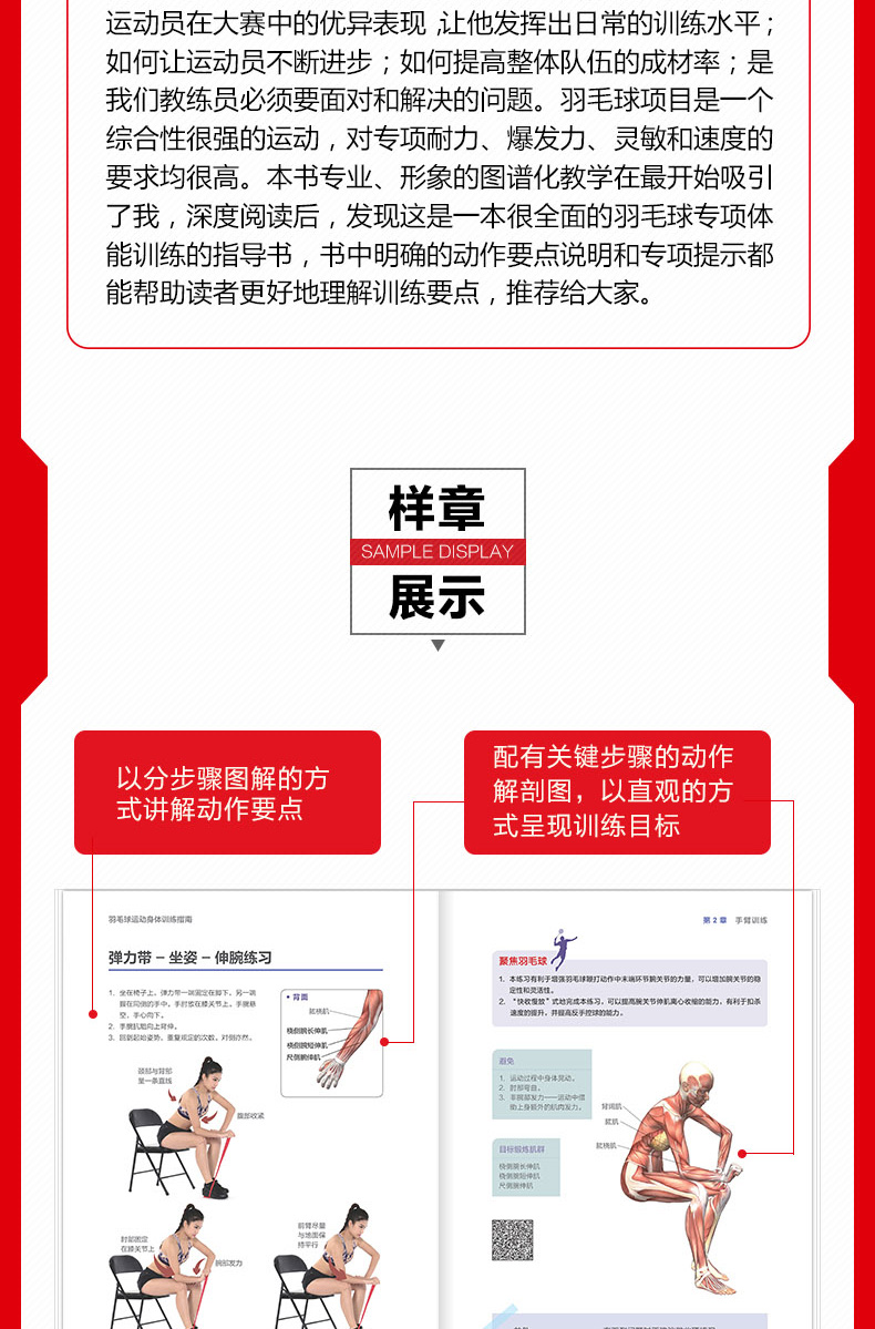優秀的身體素質是技術水平得以良好發揮的必要支撐。 《羽毛球運動身體訓練指南》針對羽毛球運動提供了適合手臂、肩部與上背部、胸部、軀幹、臀部、腿部進行的練習動作,同時以分步驟圖解的方式講解動作要點,並配有關鍵步驟的動作解剖圖,以直觀的方式呈現訓練目標,幫助練習者有針對性地進行肌肉訓練,有效提昇運動水平。此外,《羽毛球運動身體訓練指南》針對每個訓練動作都標註了注意事項、目標鍛煉肌群,以及與羽毛球技術相結合的要點註釋,適合想不斷提高技術的羽毛球愛好者、專業運動員,以及致力於提升執教水平的教練員閱讀。