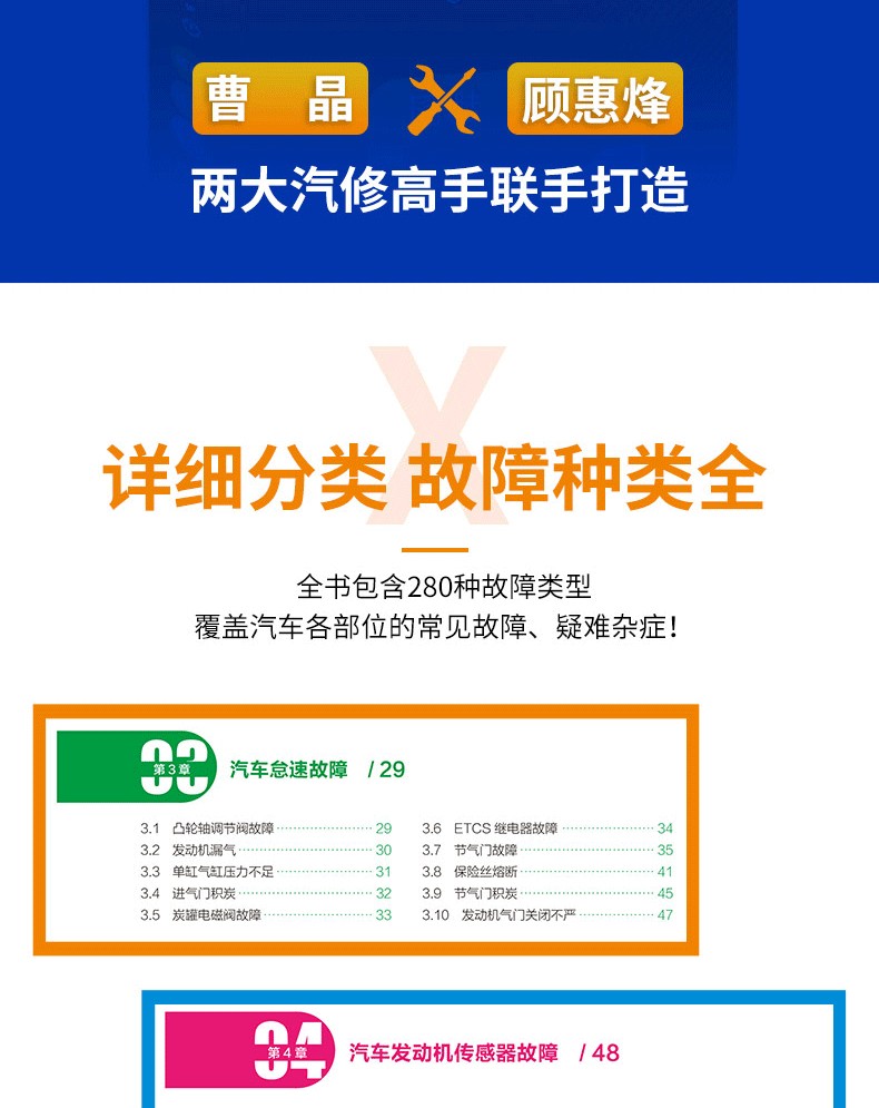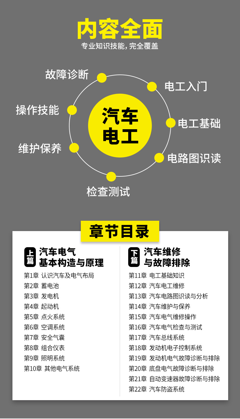 全書分上下兩篇共22章介紹。上篇為汽車電氣基本構造與原理,以全彩圖解的形式,重點介紹汽車電氣系統各大組成部件的構造原理;下篇為汽車維修與故障排除,結合視頻講解,重點介紹汽車電工維修基本知識和操作技能。