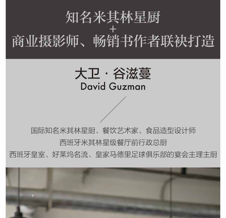 大衛·谷滋蔓是西班牙米其林餐廳的前行政總廚,邱子峰是著名的美食商業攝影師,他們將多年的從業經驗傾情奉獻,希望大家在享用美食的同時,更能體驗舌尖的藝術。