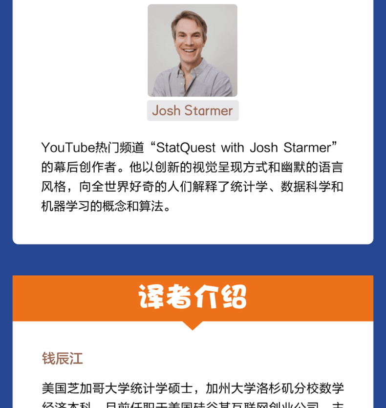 Josh Starmer,YouTube熱門頻道「StatQuest with Josh Starmer」的幕後創作者。他以創新的視覺呈現方式和獨特的教學風格,向全世界好奇的人們解釋了統計學、資料科學和機器學習的概念和演算法。 StatQuest幫助全世界各行各業的人贏得數據科學競賽、通過考試、順利畢業、成功求職或實現晉升,因此,Josh被大家譽為“矽谷的守護神”;他也被譽為“統計學的比爾·奈”,因為他以趣味橫生的方式使機器學習這一話題變得引人入勝;還有人讚譽他為“數據的鮑勃·羅斯”,因為他拒絕通過幽默歌曲的炒作。