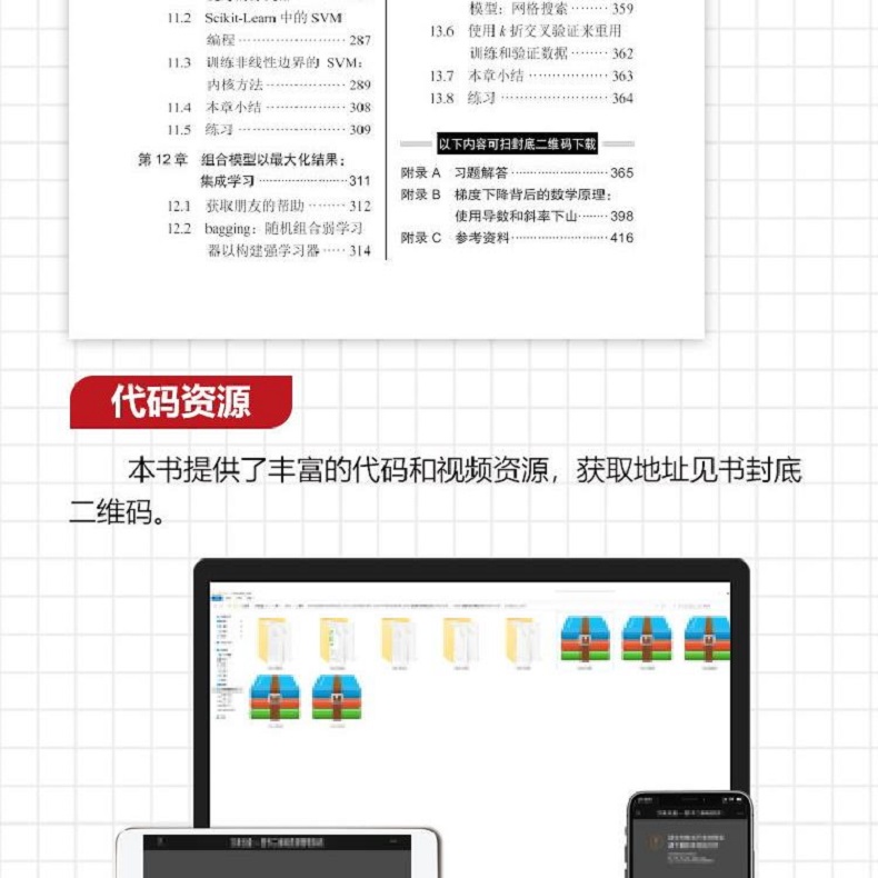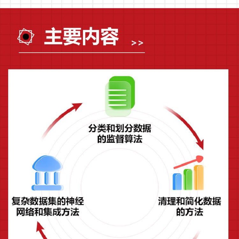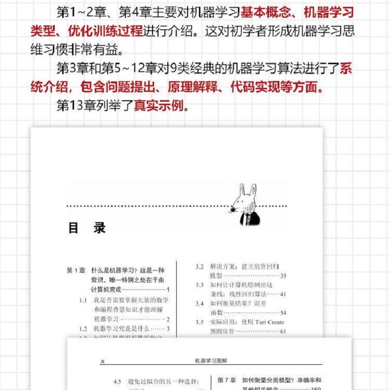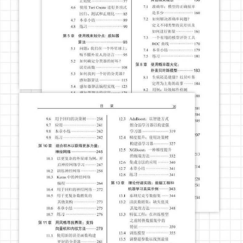 本書前3章著重介紹了機器學習的整體框架和主要思想,從第4章起,介紹了各種機器學習演算法:從基礎的線性回歸(第4章)和邏輯回歸(第6章)到樸素貝葉斯(第7章)和決策樹(第10章),最後介紹了支持向量機(第11章)和神經網路(第12章)。在介紹機器學習演算法的同時,本書也穿插介紹了機器學習的進階知識和實用技巧,如梯度下降法(第5章)、模型效能度量(第8章)和防止過度擬合的正規化方法(第9章)。