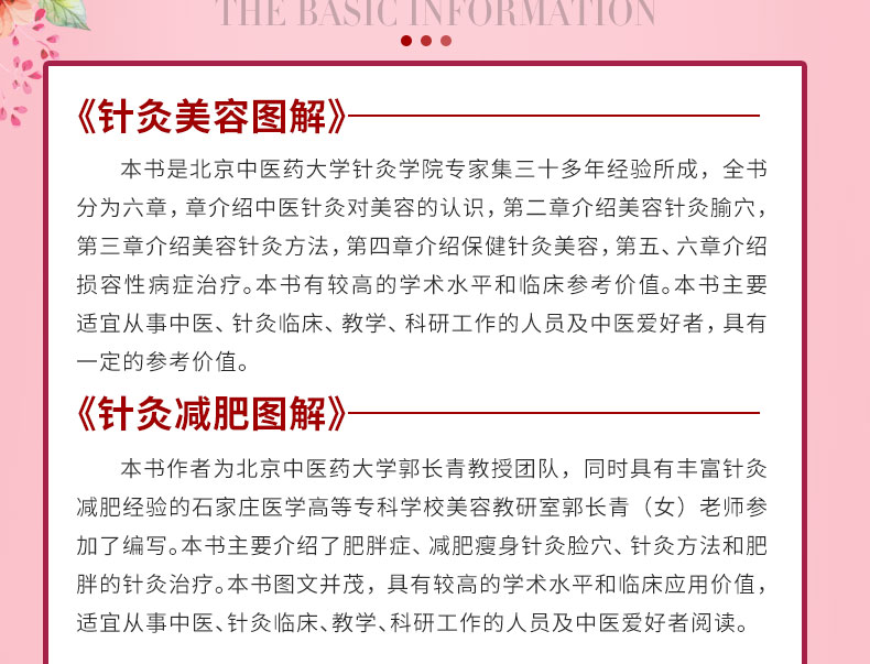 本書是北京中醫藥大學針灸學院專家集三十多年經驗所成,全書分為六章,第一章介紹中醫針灸對美容的認識,第二章介紹美容針灸腧穴,第三章介紹美容針灸方法,第四章介紹保健針灸美容,第五、六章介紹損容性病症治療。本書有較高的學術水平和臨床參考價值。本書主要適宜從事中醫、針灸臨床、教學、科研工作的人員及中醫愛好者,具有一定的參考價值。