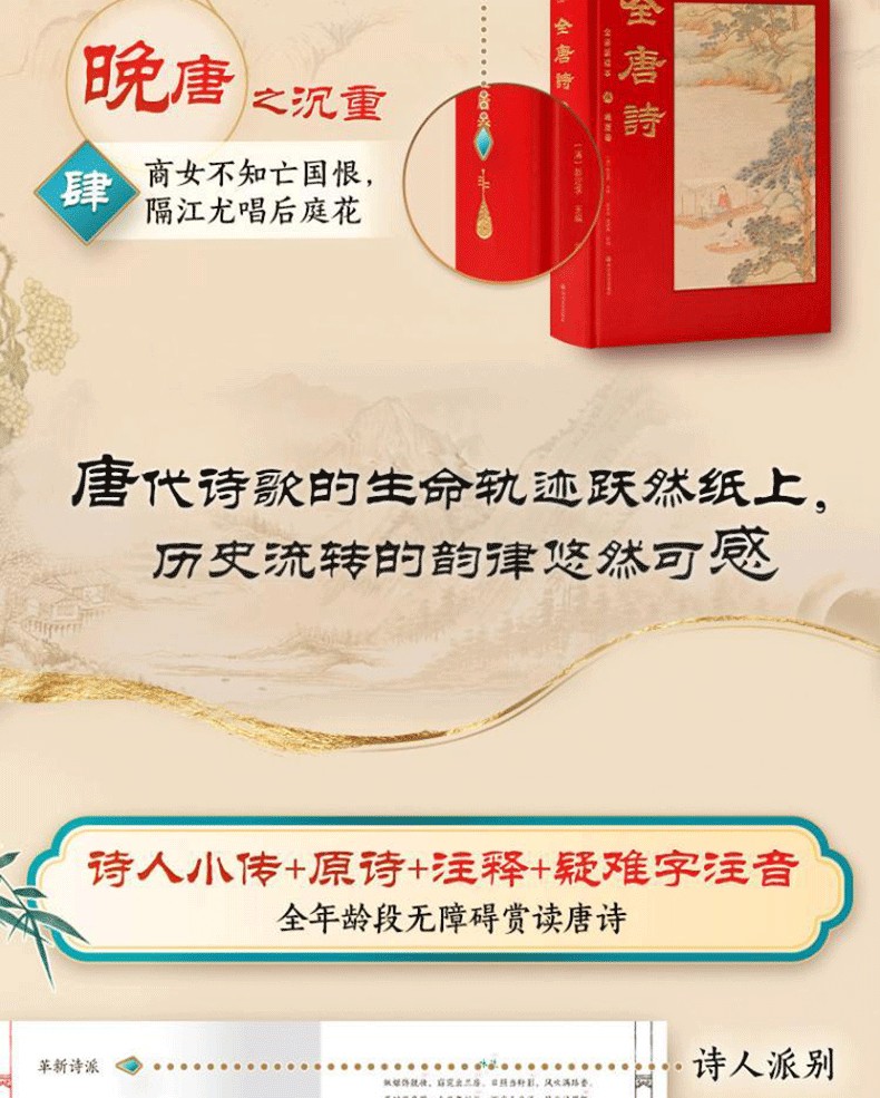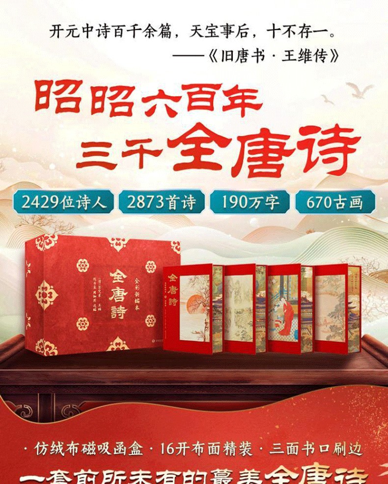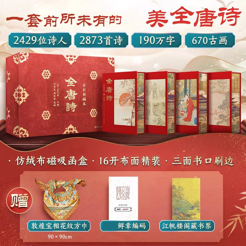 《全唐詩》全彩版,共四冊,初唐、盛唐、中唐、晚唐各一本。以道揚州詩局本及四庫全書本《禦定全唐詩》為底本,囊括了全部詩人2429人,原則上保證所有詩人收錄。並依詩歌流派分為:山水田園詩派、邊塞詩派、宮廷詩派、改革派等,收錄詩人代表作,剔除誤收的、殘斷的詩作,最終精選2873首詩歌,輔以詩人小傳、註釋及全彩插圖。詩人以其所在時代為準,按首字母排序,方便讀者查詢。