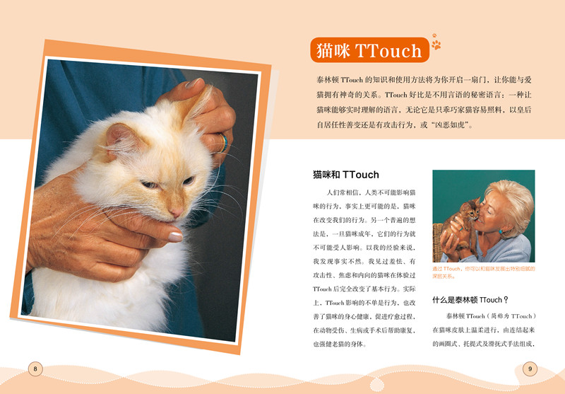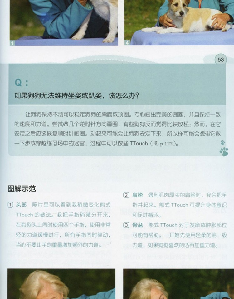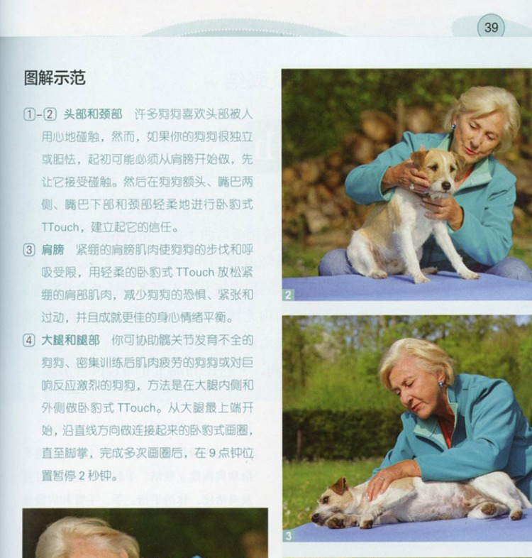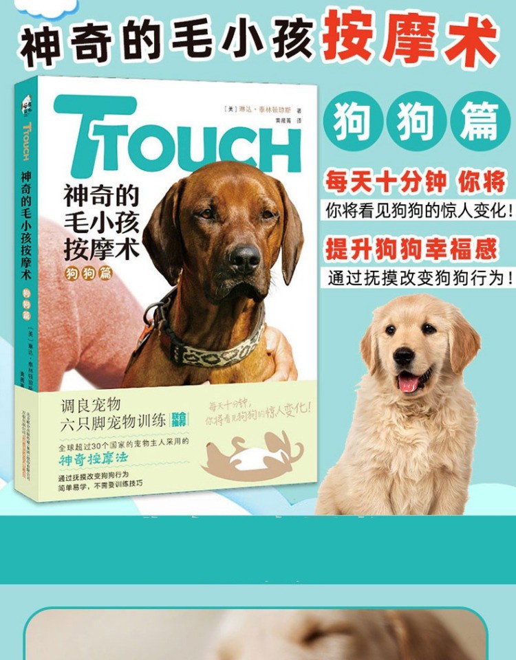 琳達‧泰林頓瓊斯著黃薇菁譯的《TTOUCH神奇的毛小孩按摩術(狗狗篇)》講述的TTouch是一種溫和尊重的訓練方法,能夠提升動物的健康和性情,並發展人與動物之 間的信任關係。 訓練是為了能讓動物與人類更舒適自在地生活,TTouch以此為目的,不僅關注動物的行為,更著眼於動物的身體健康以及性格的發展,力求讓動物的表現得到整體的提升。 而整個的過程,由於使用充滿尊重、非常溫和的TTouch方法,使我們與動物的信賴關係也得到提升。