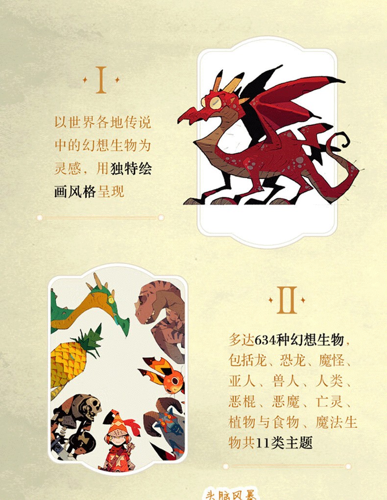 ●多達634種幻想生物,包括龍、恐龍、魔怪、亞人、獸人、人類、惡棍、惡魔、亡靈、植物與食物、魔法生物共11類主題。
