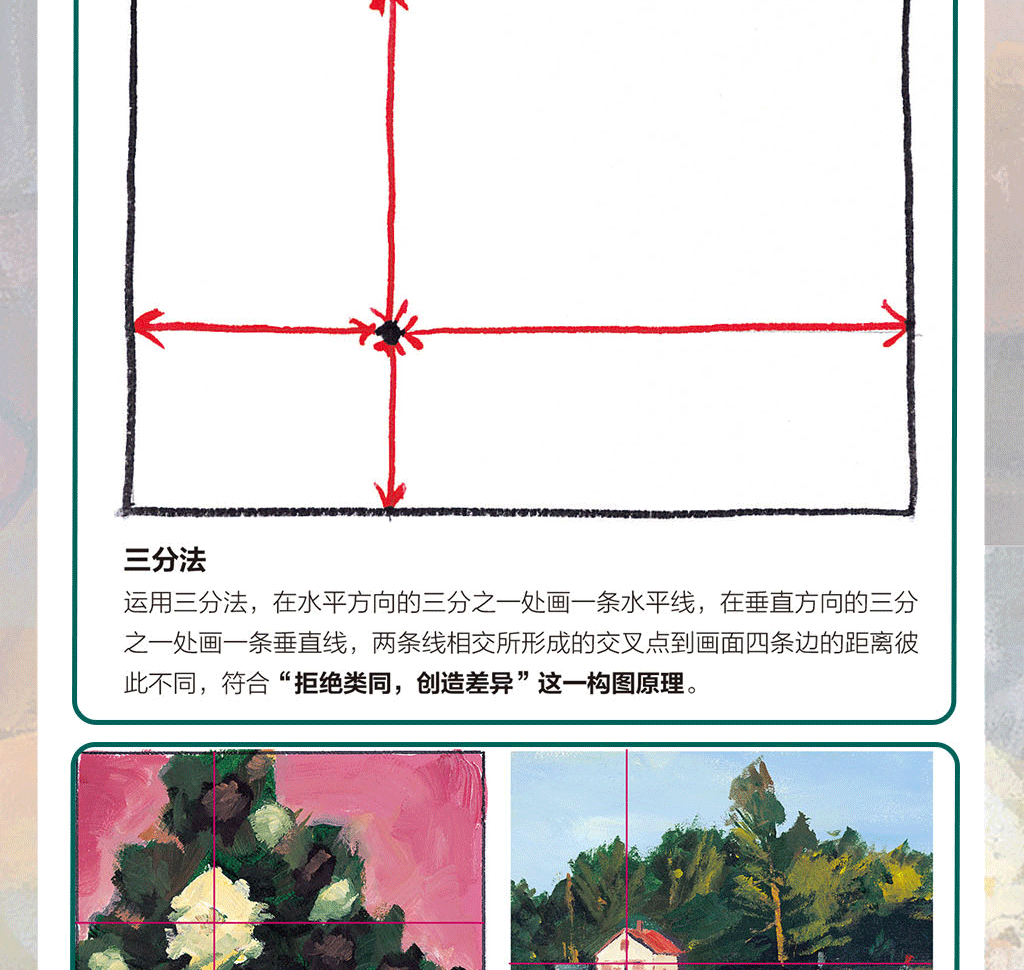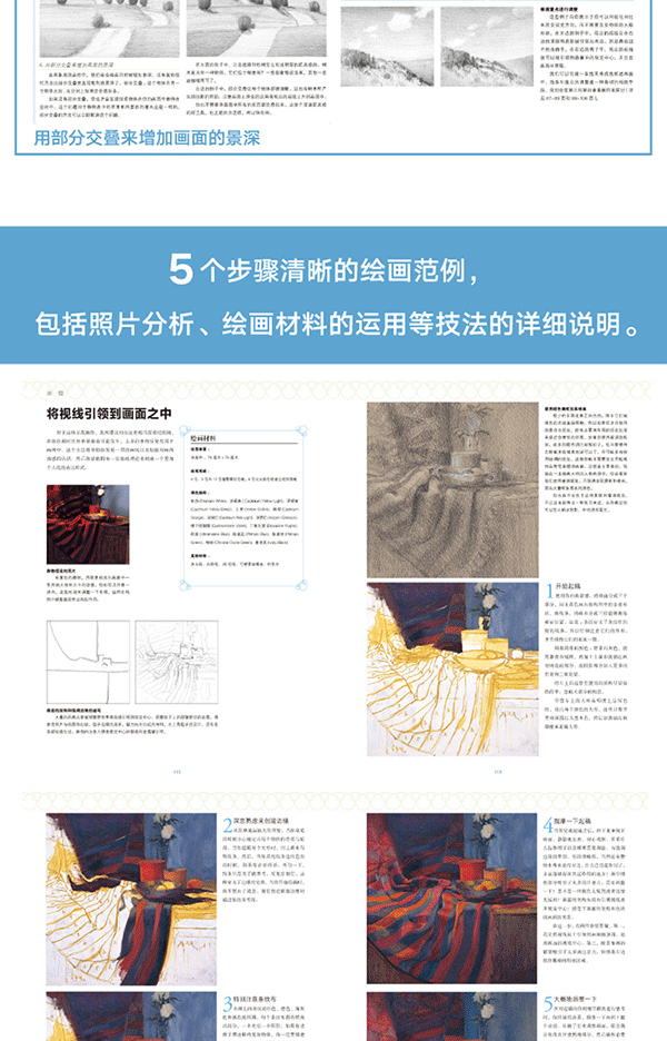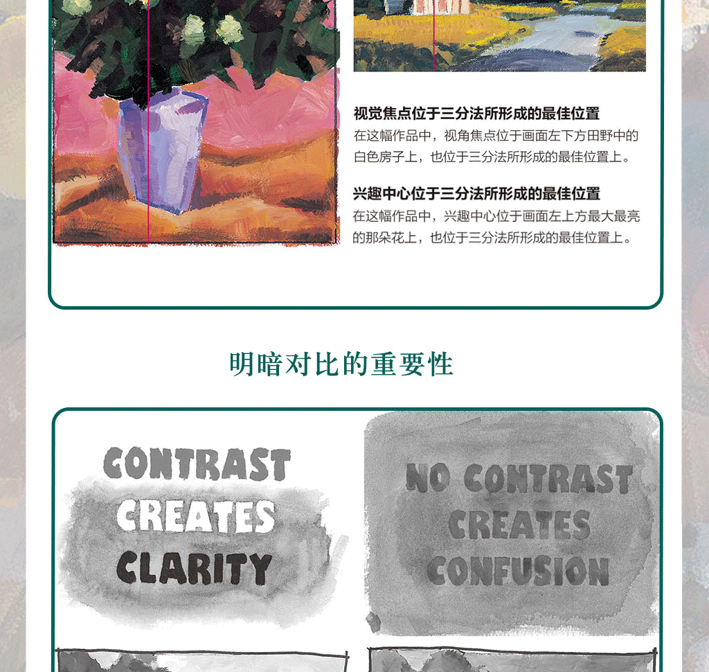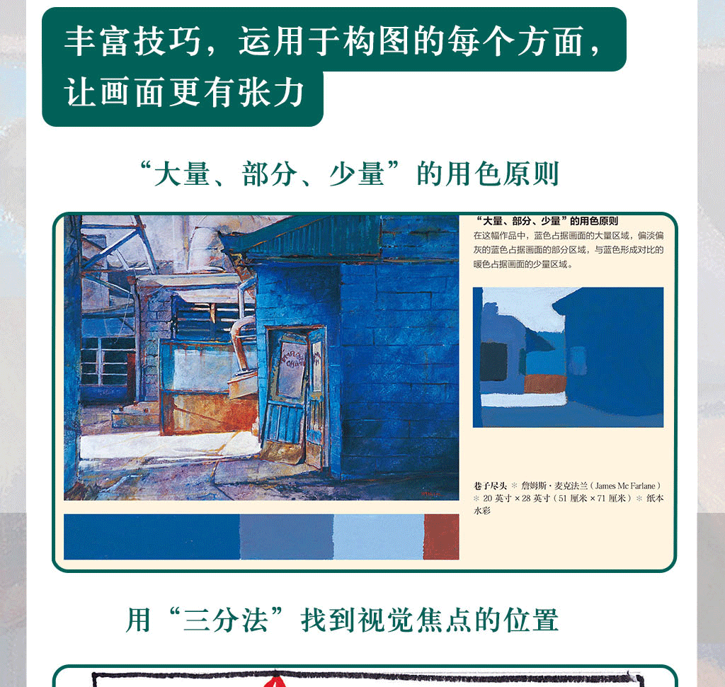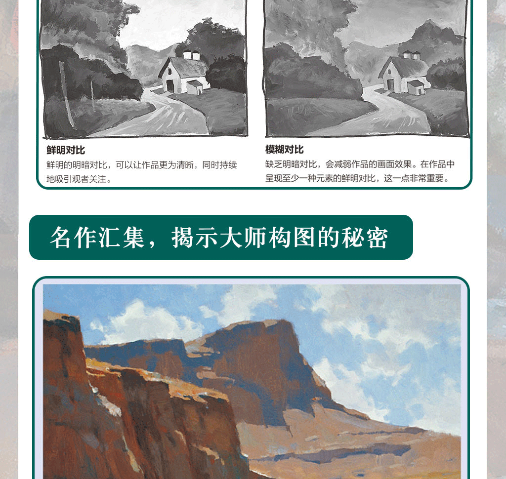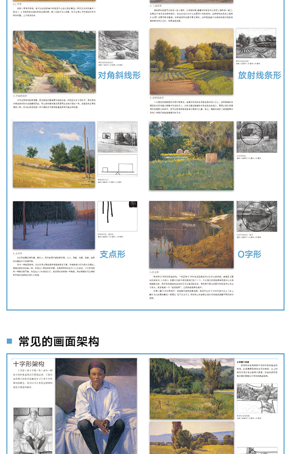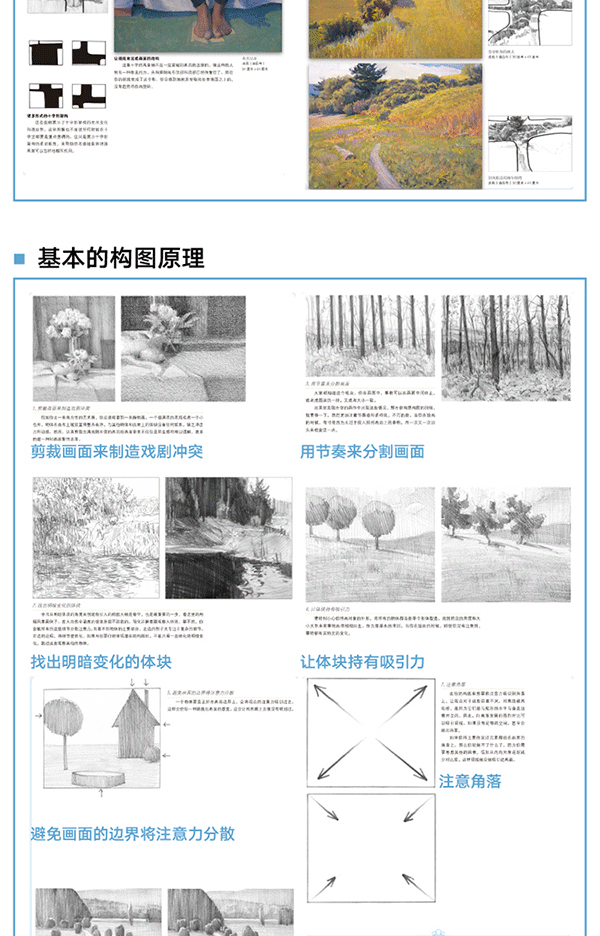 用明暗體塊來創造興趣點和戲劇性·考慮抽象體塊,而不是物體 ·找尋主要的抽象體塊·取景框的使用·參考較好的照片來著手繪畫·找出滿意的構圖·改變你的視角·臨摹你喜歡的畫作 ·大限度地利用每一次參觀美術館的機會·*天一幅構圖·素描小竅門·縮略圖·示