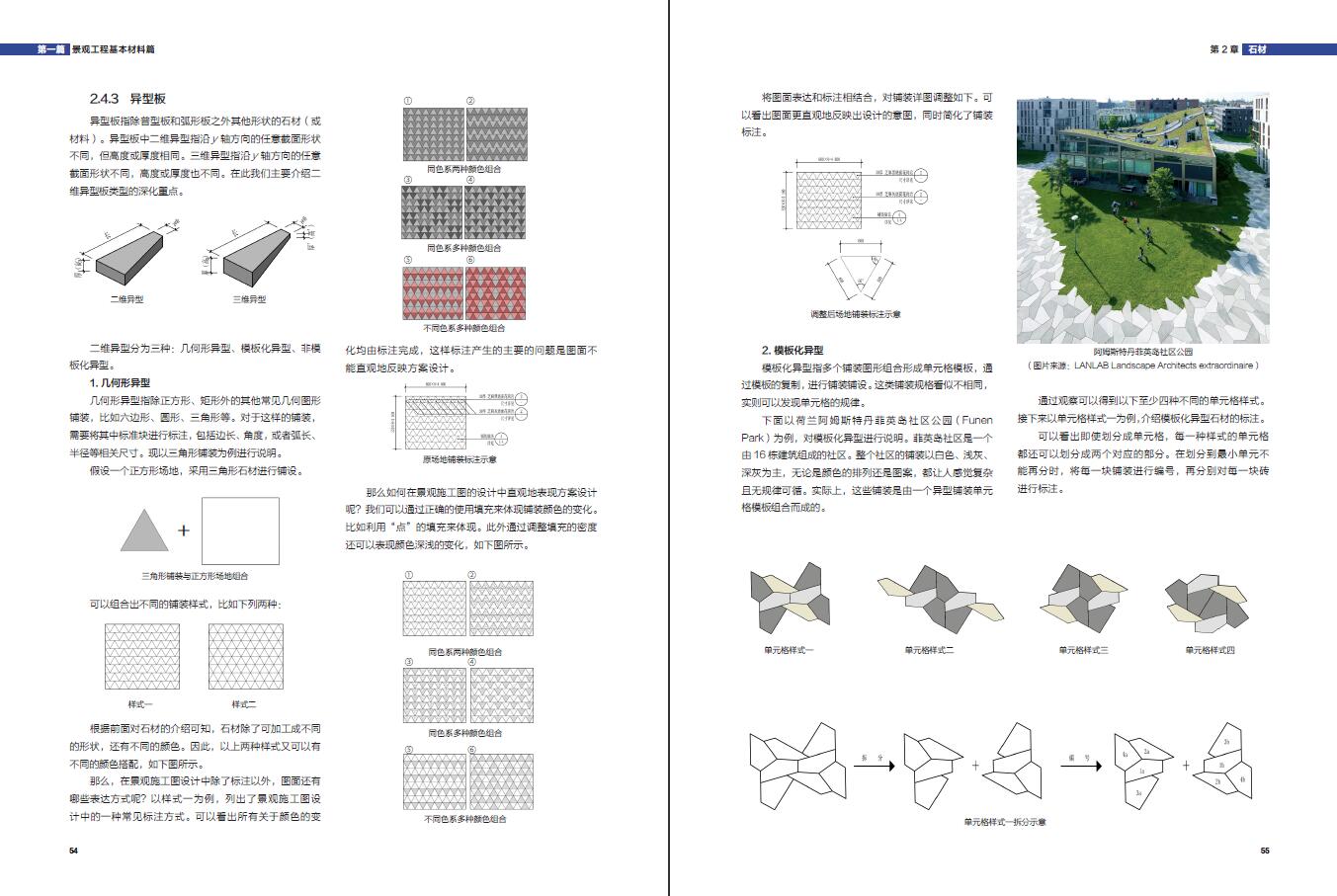 這是一本講景觀施工圖設計與繪製的實用手冊。作者在一線城市從事景觀設計13年,結合自身在景觀設計中多年來的積累與沈積,梳理出景觀施工圖設計中的常見問題及重難點,內容分為3篇,主要涵蓋景觀施工基本材料(磚、停車、鋼材、混凝土)、鋪裝設計與鋪裝圖製圖基礎(道路、牆緣石、停車位、園路設計)詳園小品(道路、牆緣設計)
